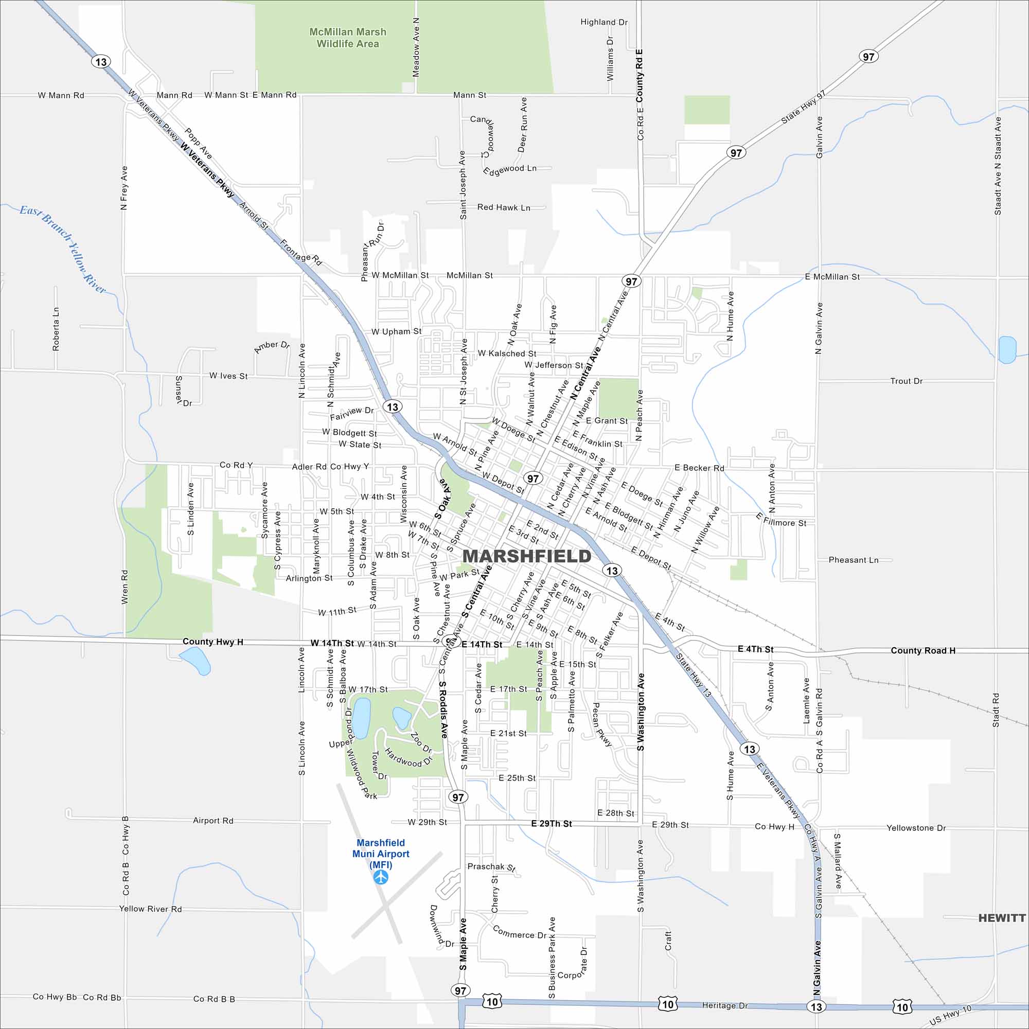 See Marshfield on our map, located in central Wisconsin. You can find this city in both Wood and Marathon counties. Our map includes its roads, parks and waterways.