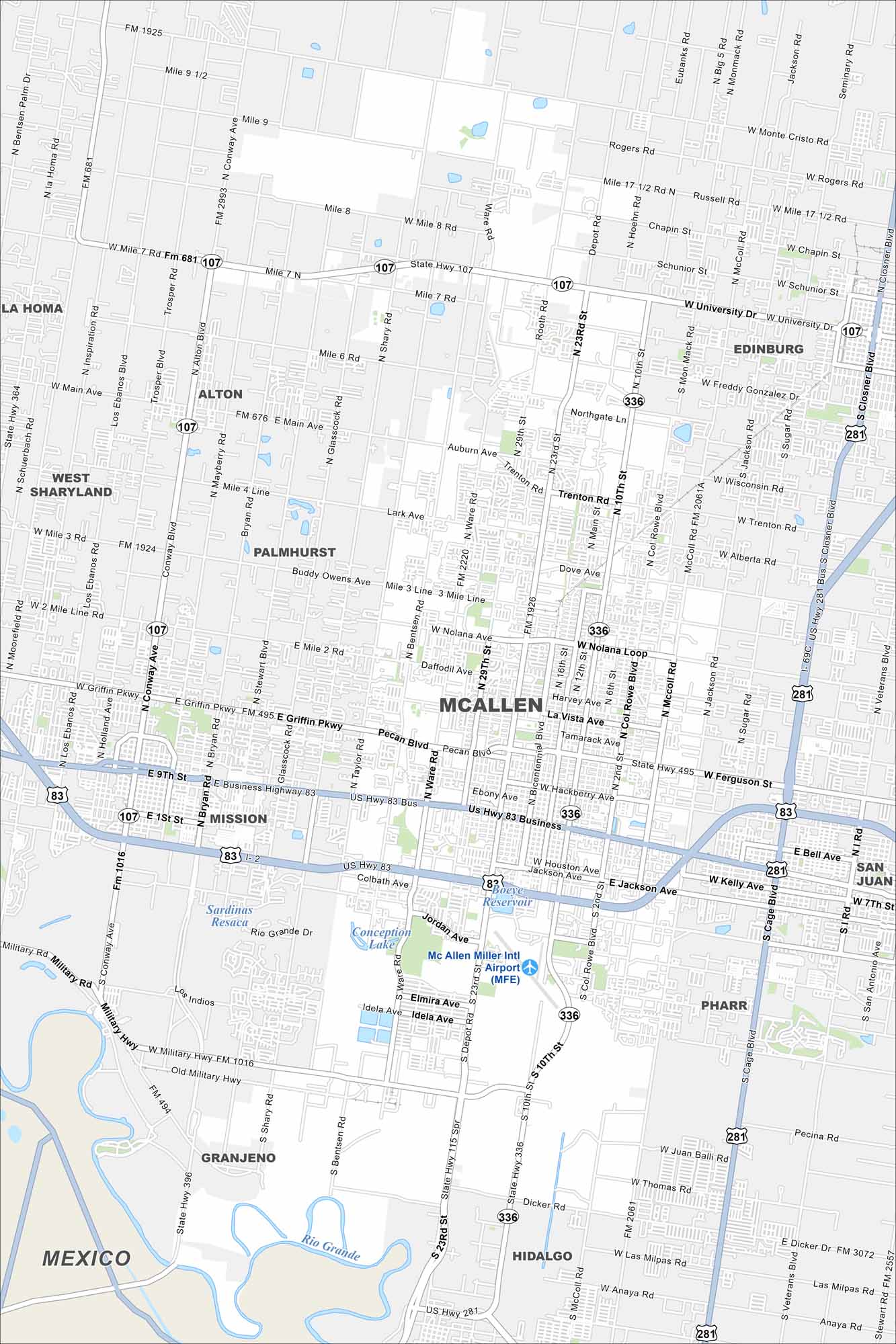McAllen sits in the Rio Grande Valley near the Mexican border. Our map shows its main roads, airport, lakes and rivers.