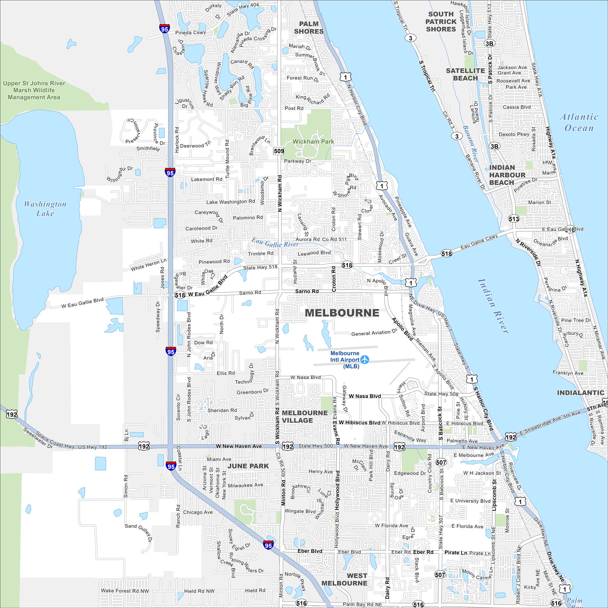 Melbourne lies along the Indian River Lagoon near the Atlantic coast. Our map highlights the causeways, downtown, and nearby beaches. It’s also really close to Cape Canaveral.