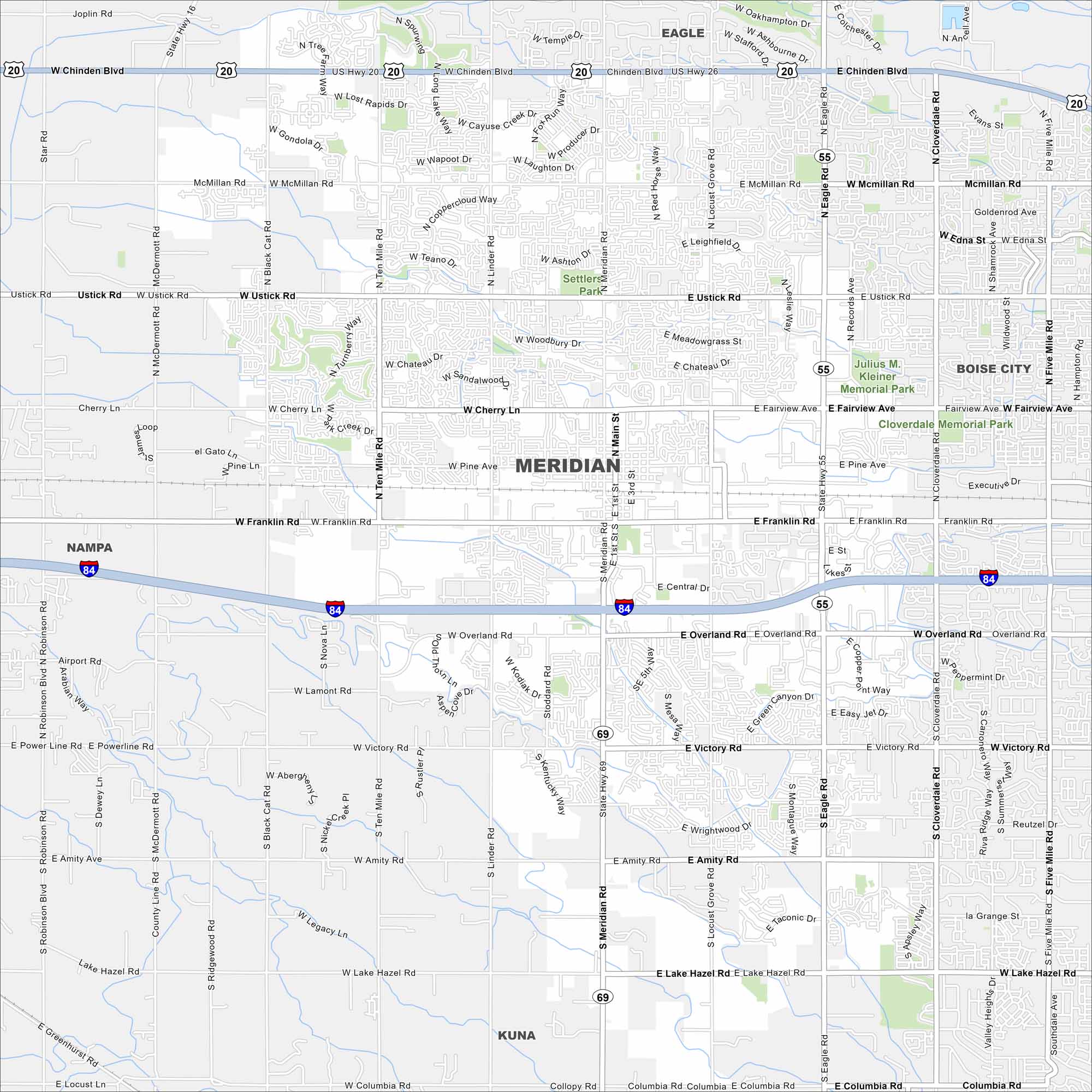 Meridian sits between Boise and Nampa. Our map highlights sprawling neighborhoods, Interstate 84, and new growth. It’s one of Idaho’s fastest-growing cities.