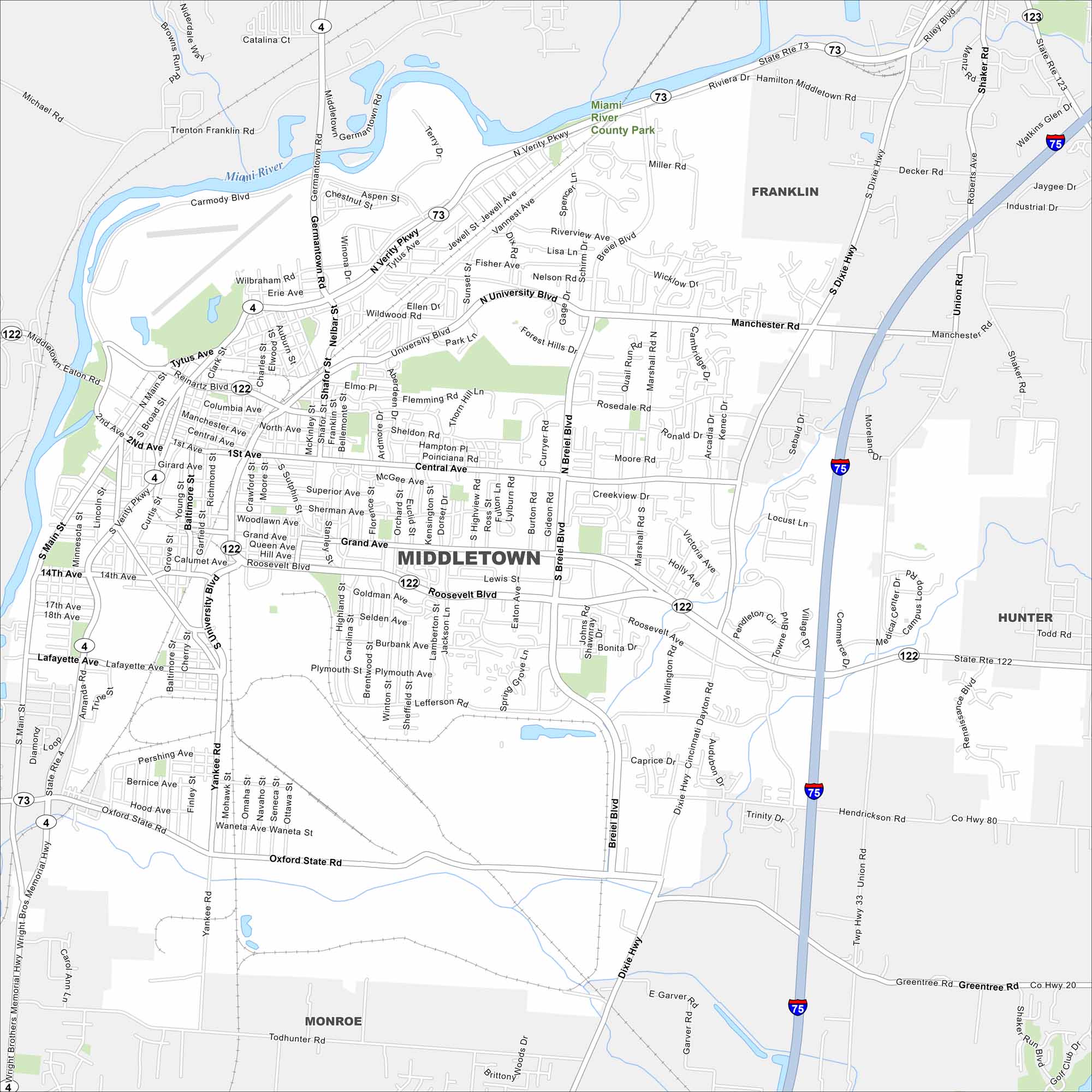 Middletown lies between Cincinnati and Dayton. Our map shows the Great Miami River flowing through town. Neighborhoods, industry, and highways all play a major role here.