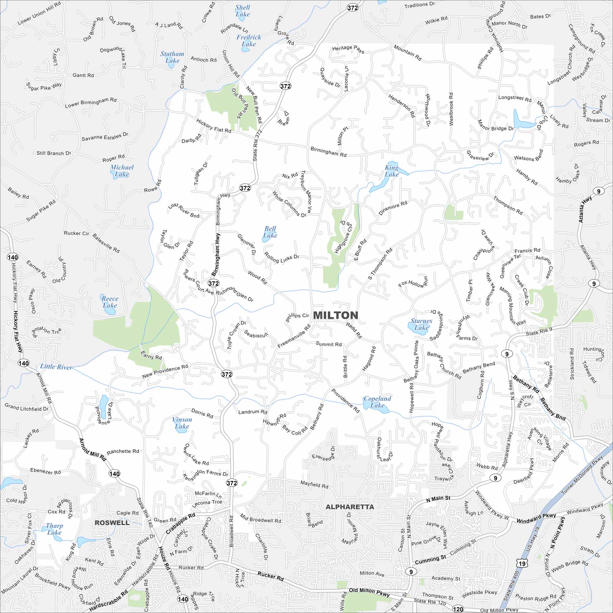 Learn about Milton with our road map. Rolling hills, horse farms, and neighborhoods dominate the landscape. It’s one of metro Atlanta’s more rural-feeling suburbs.