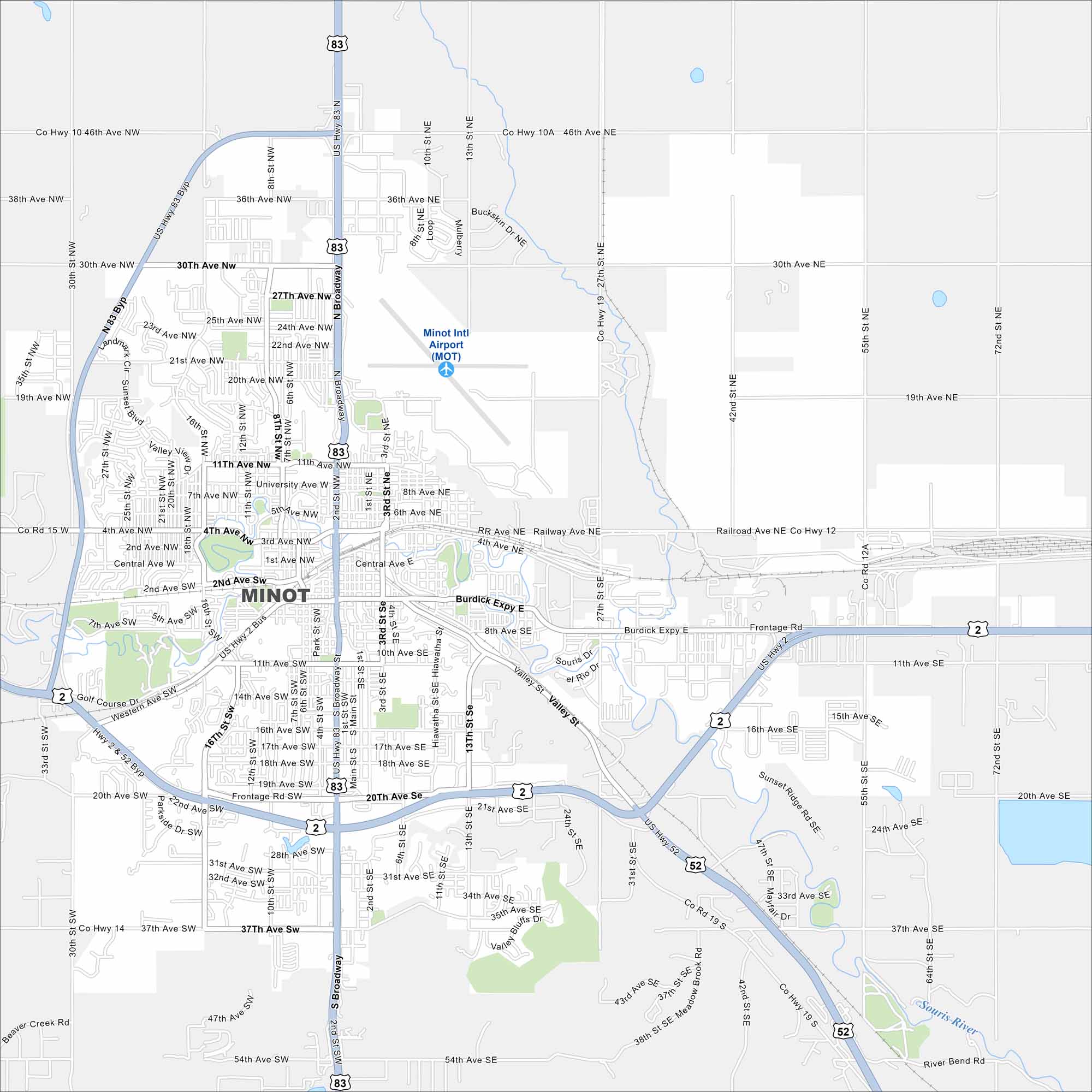 Discover Minot on our map of this north-central North Dakota city. The Souris River winds through town, shaping its layout. The city is a key hub for the surrounding prairie.