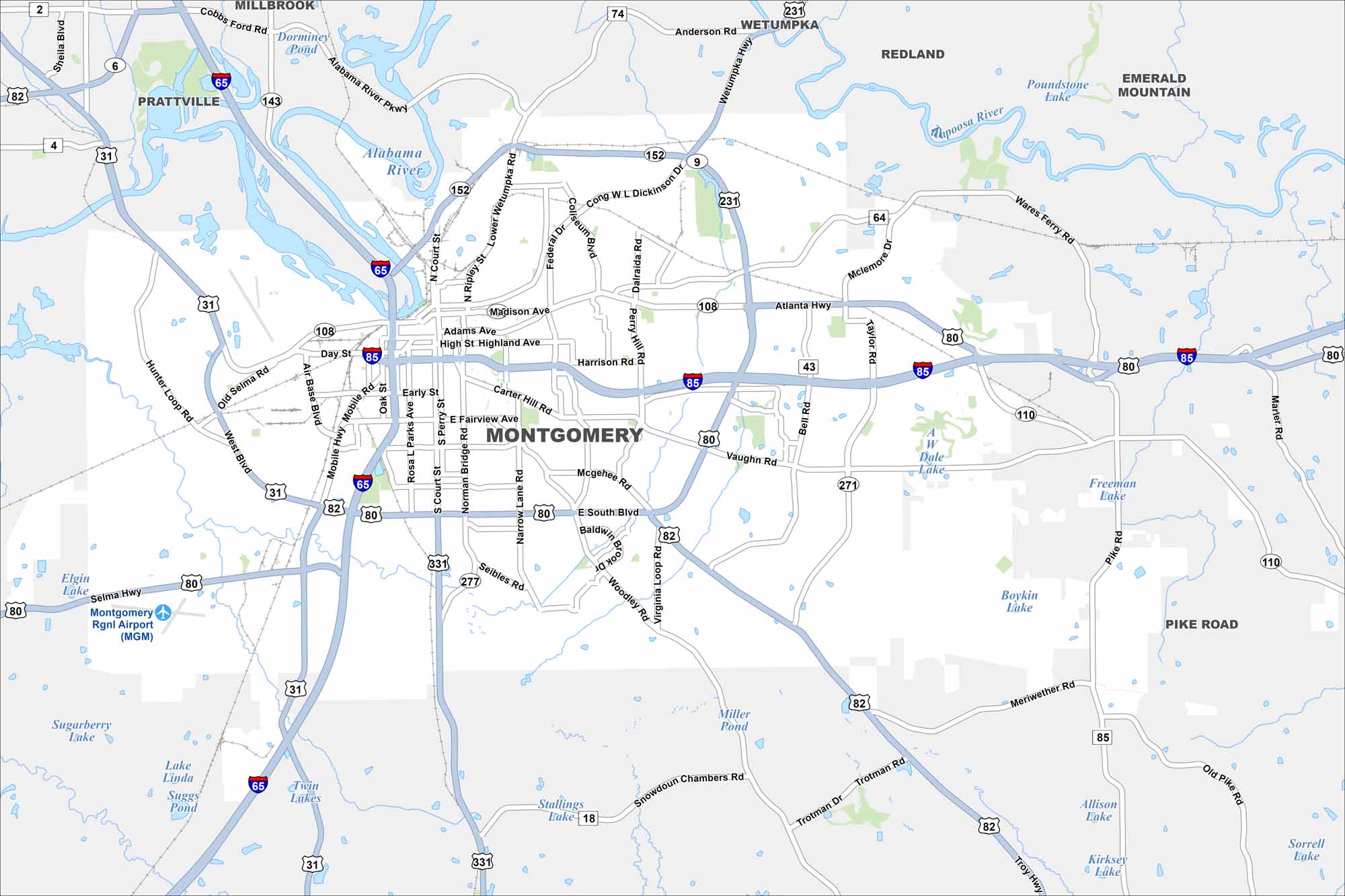 Our map of Montgomery shows its highways, waterways, parks and lakes. The city is central to both state politics and civil rights history. Government buildings, historic districts, and modern neighborhoods all take center stage.