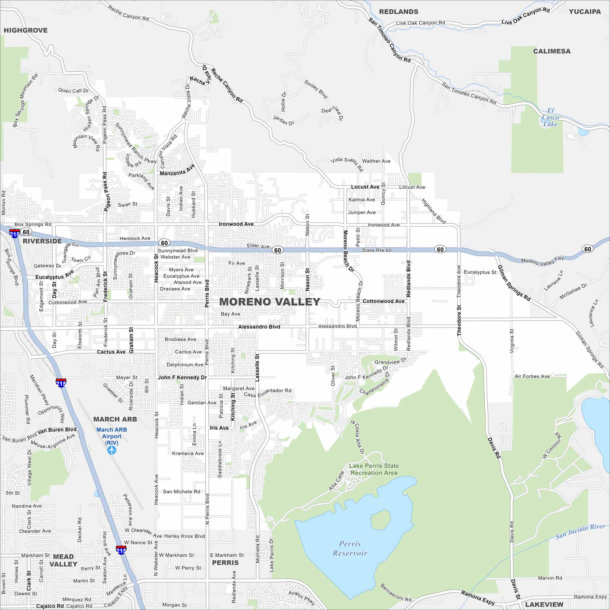 Our map of Moreno Valley shows wide residential areas backed by rugged hills. Highways connect it across the Inland Empire. Perris Reservoir and Recreational Area is a major landmark nearby.