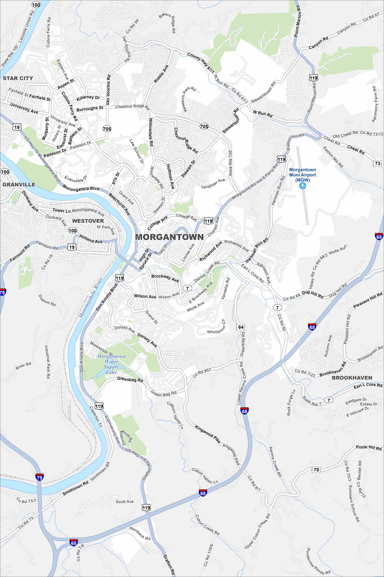 Our map of Morgantown shows the Monongahela River winding through town. West Virginia University dominates the landscape. Hills surrounding the city so it’s a mix of campus life and mountain scenery.