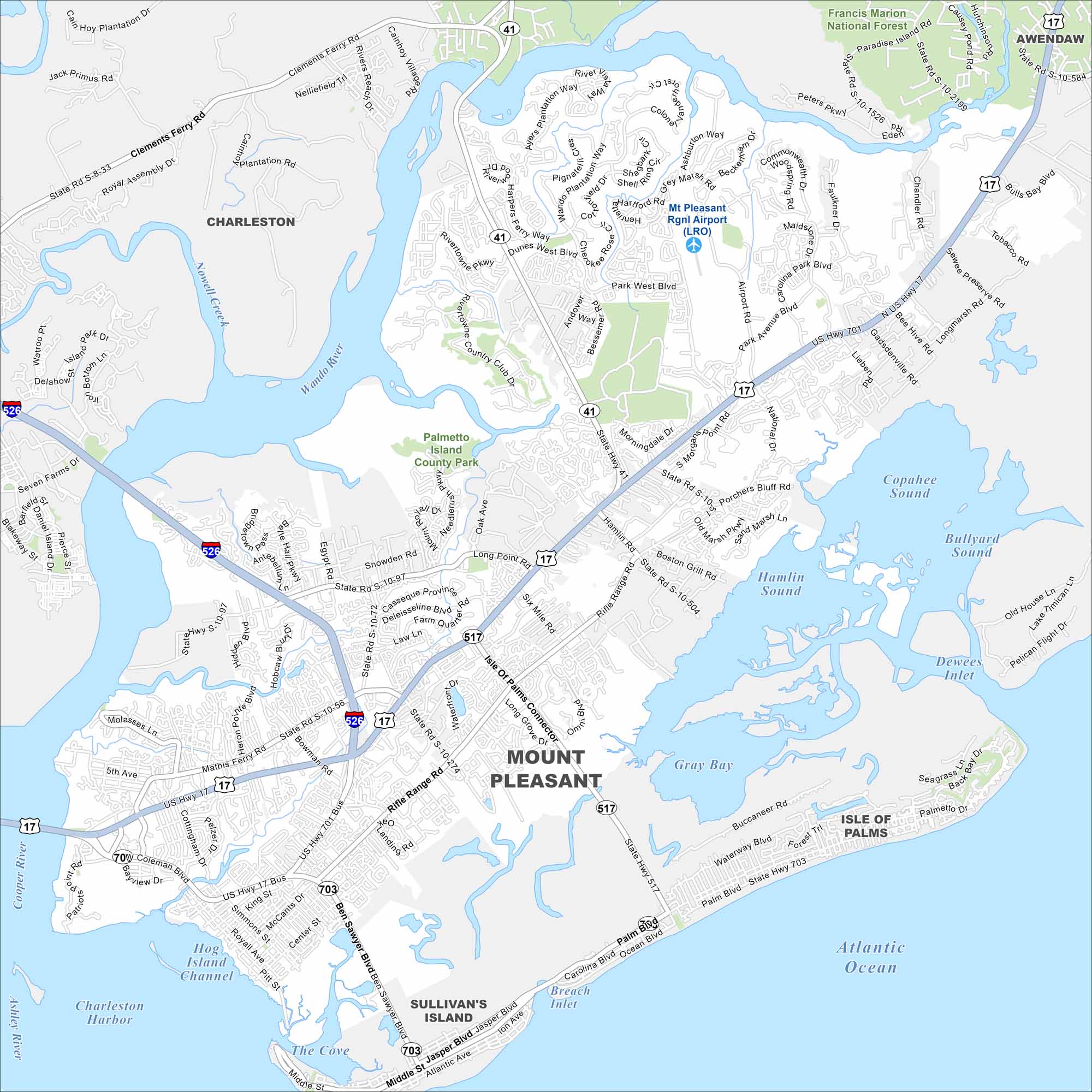 Our map of Mount Pleasant highlights its spot along Charleston Harbor. Bridges, waterways, and suburban neighborhoods define the city’s layout. It’s a key gateway to the beaches nearby.