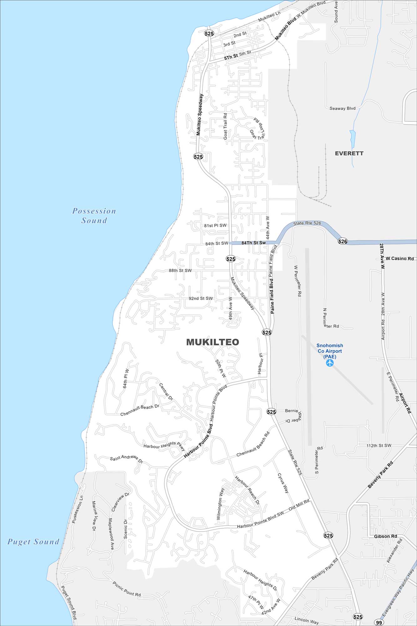 Check out Mukilteo with our map of Puget Sound. It’s not too populated here with neighborhoods stretching up into forested hills. The ferry terminal and waterfront are stand-outs along with the nearby Boeing Everett plant.