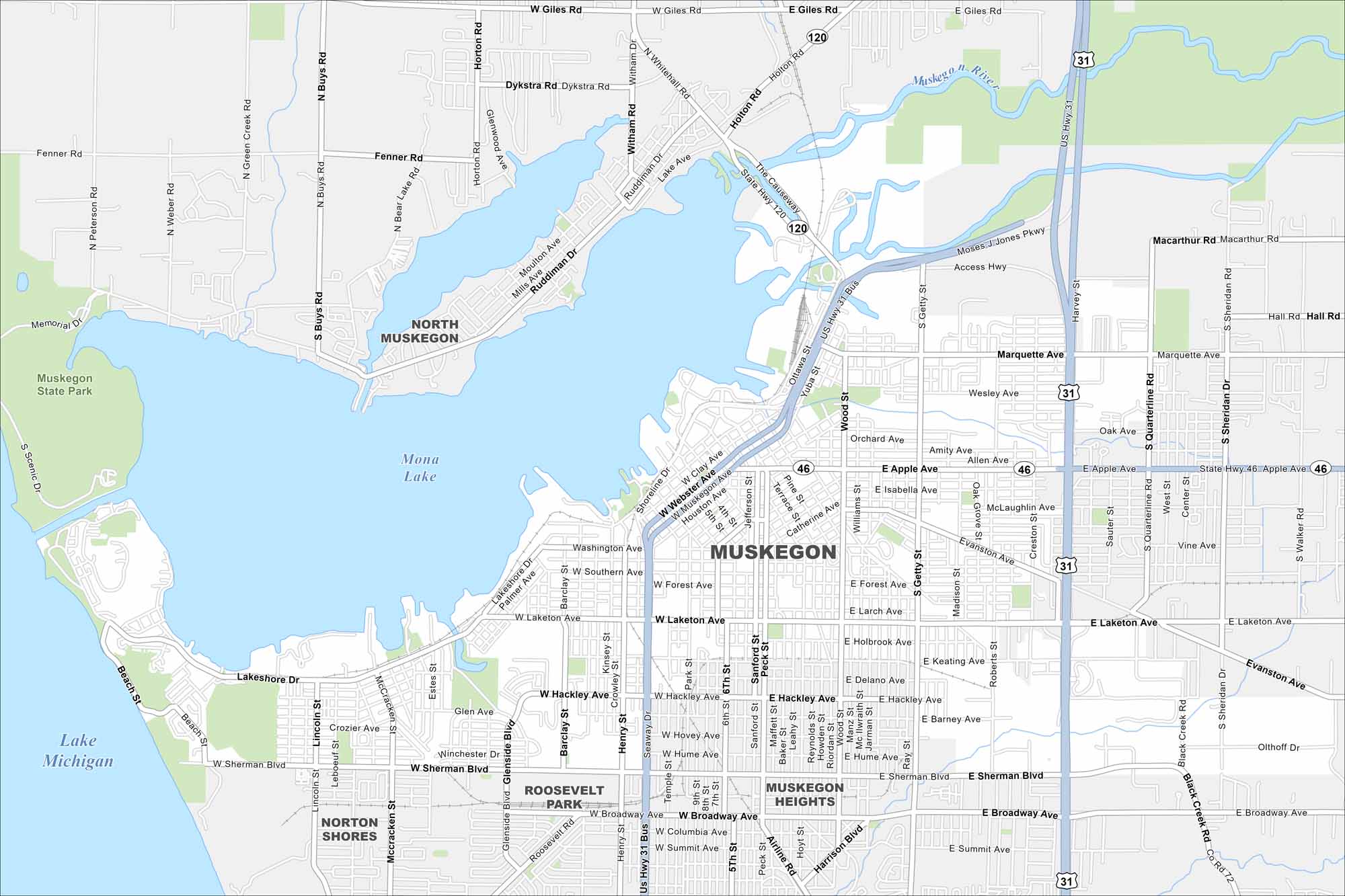 Muskegon rests on Lake Michigan with a large harbor and waterfront. Our map shows its downtown area, industrial port, and surrounding neighborhoods. The beaches are a major draw in summer.