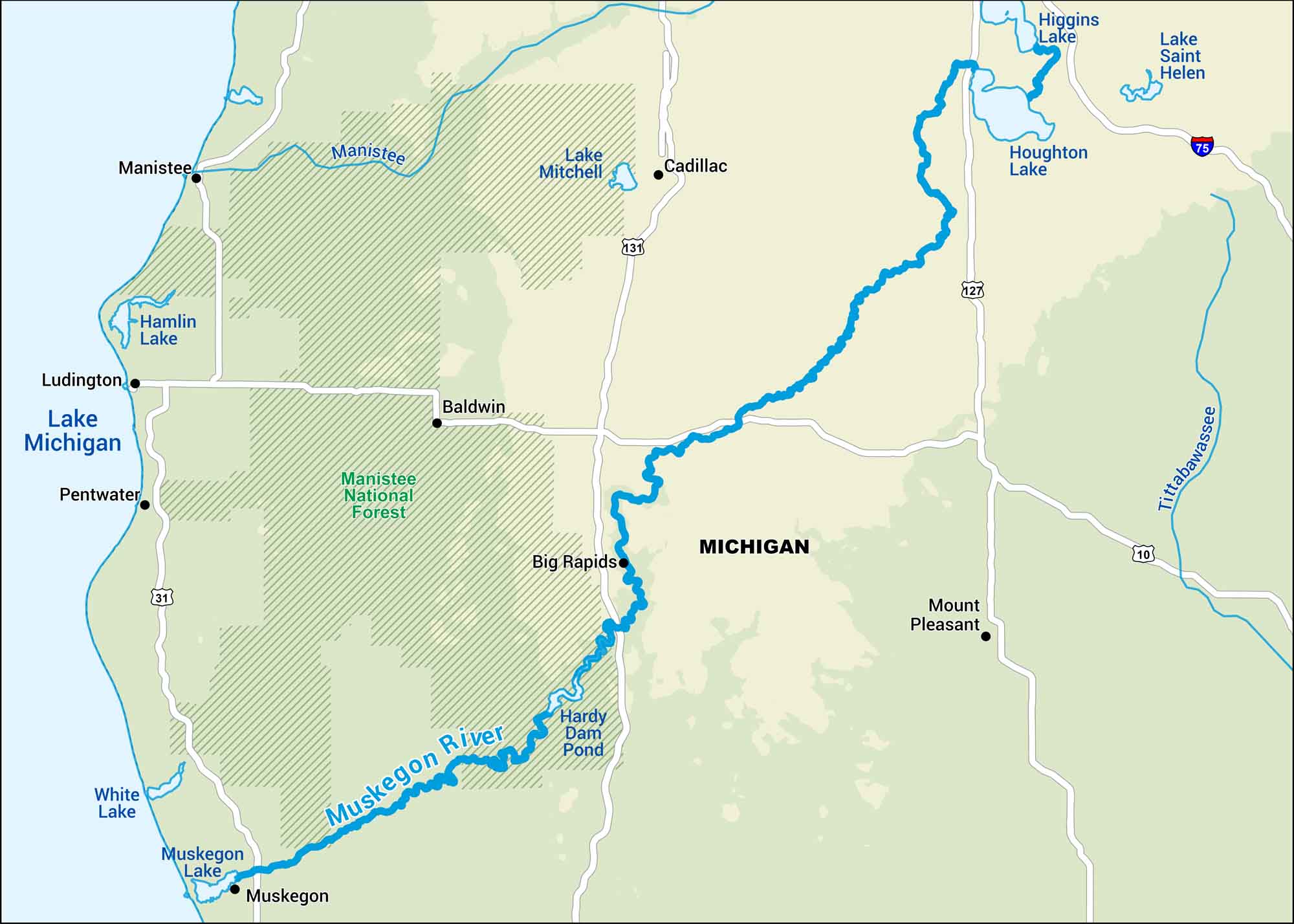 The Muskegon River winds through central Michigan, flowing from Houghton Lake to Lake Michigan. It’s one of those rivers that still feels quiet and lived-in. See it on our map above.