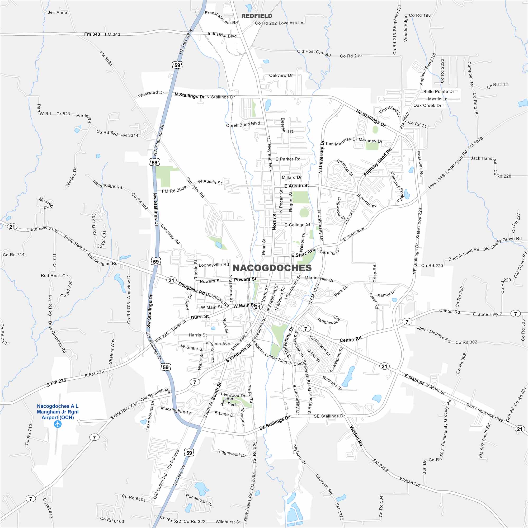Nacogdoches is often called the oldest town in Texas. Our map shows its historic downtown, airport, waterways and highways. It’s located deep in East Texas.
