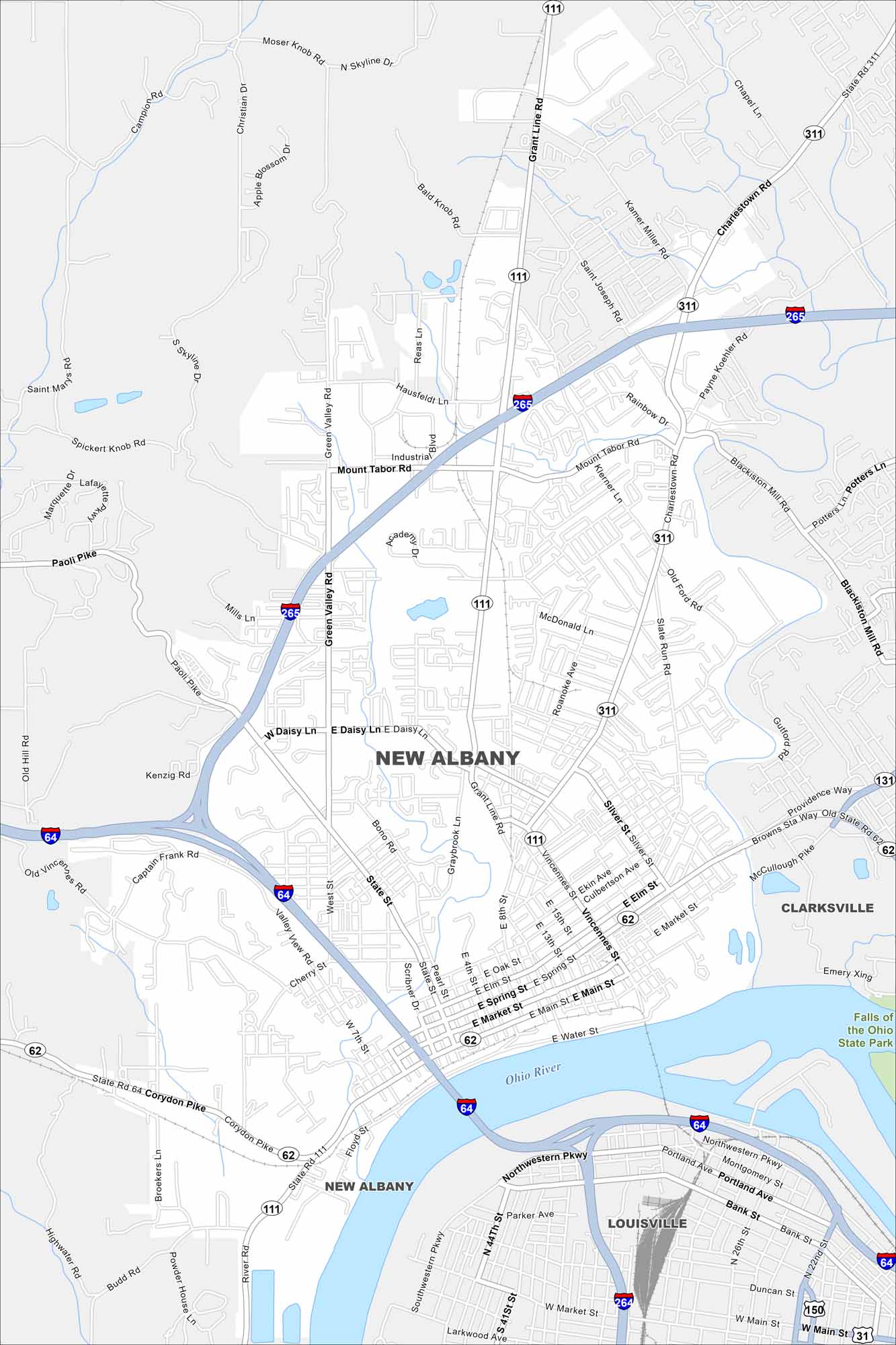 Our map of New Albany shows this city located on the Ohio River across from Louisville. Downtown sits by the riverfront, with neighborhoods rising into the hills.