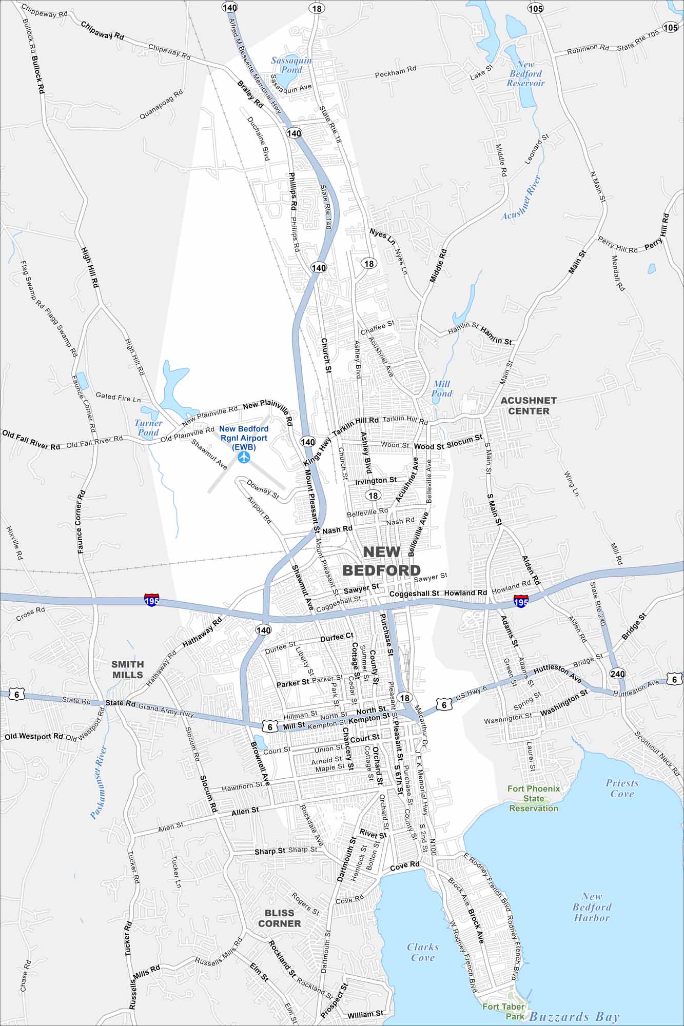 New Bedford lies on Buzzards Bay in southeastern Massachusetts. Check out this map to see its harbor, working waterfront and downtown grid. The city is famous for its whaling history.