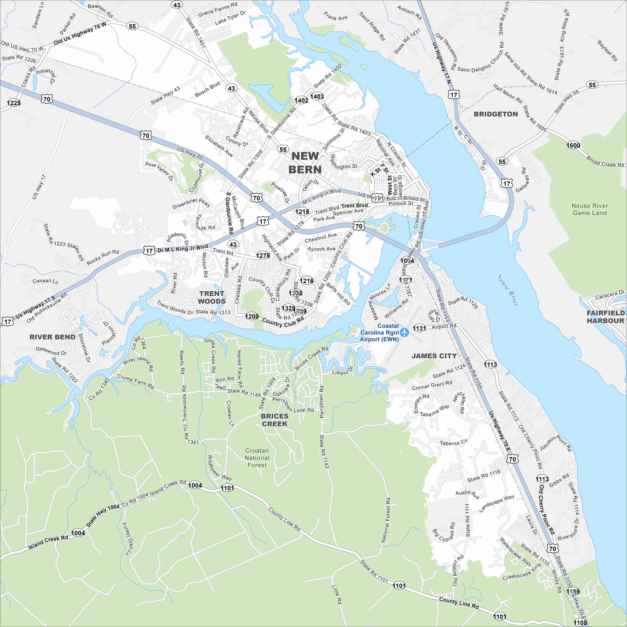 New Bern rests at the meeting of the Neuse and Trent Rivers. Our map shows its historic downtown, riverfront, and nearby neighborhoods. The city is known as the birthplace of Pepsi.