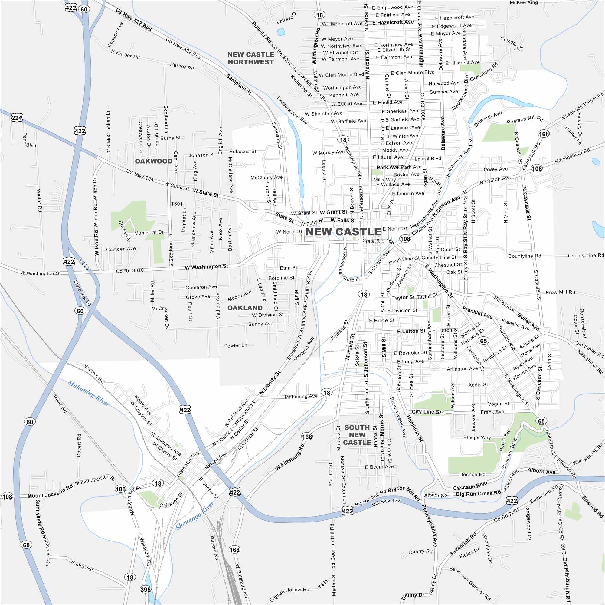 New Castle lies near the Ohio border in western Pennsylvania. Our map shows a compact downtown, river crossings, and neighborhoods on rolling hills. The city has long been tied to the steel industry.
