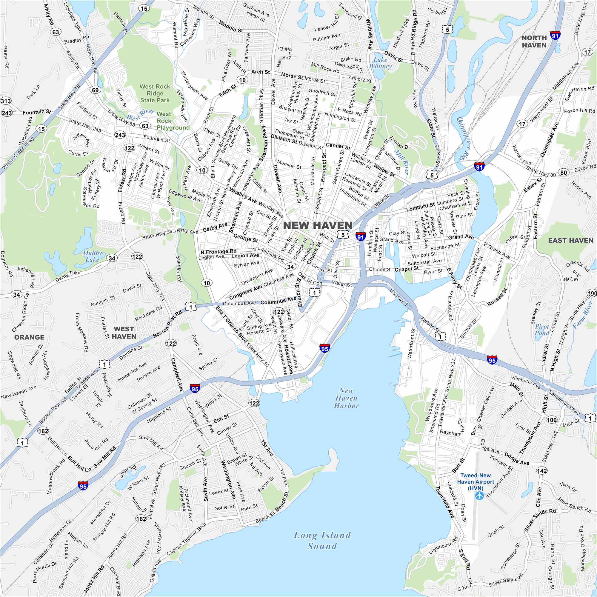 New Haven stretches along Long Island Sound with Yale University at its core. The map highlights highways, roads and the busy harbor. It’s one of the oldest and most historic cities in New England.