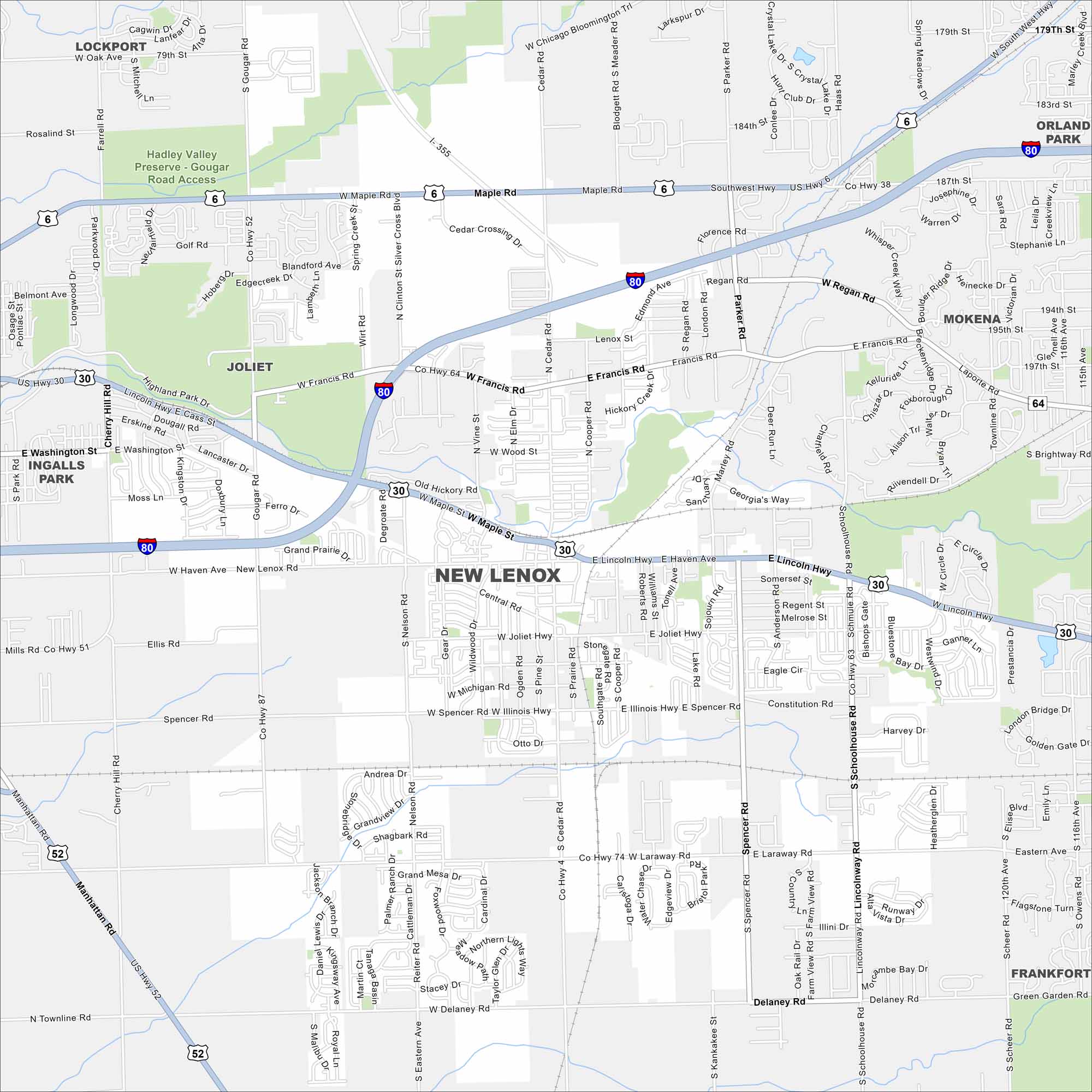 New Lenox lies southwest of Chicago in Will County. Our map shows parks, roads and highway connections. It’s a fast-growing suburb on the edge of the metro area.