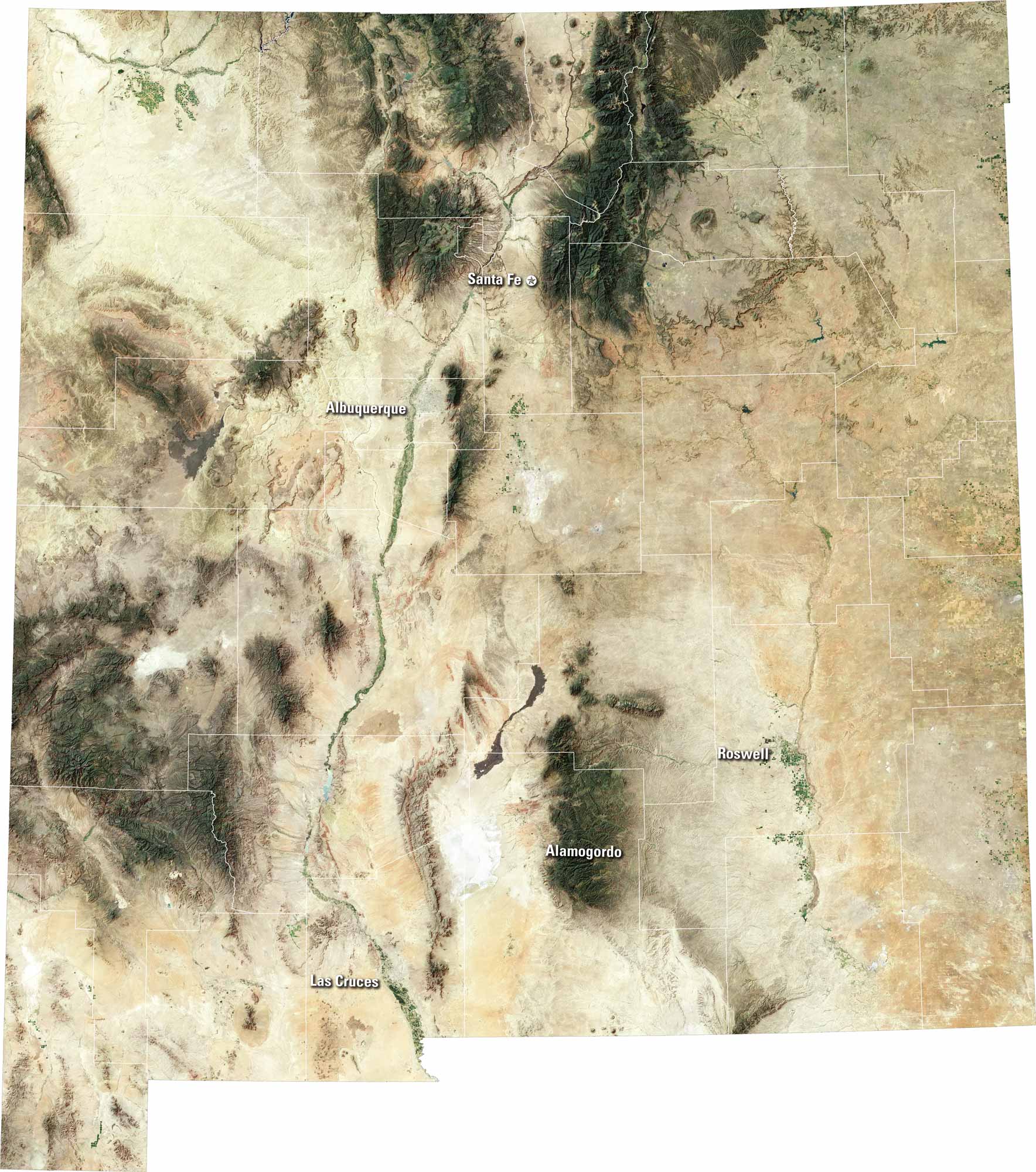 See deserts and mesas on our New Mexico satellite map. You’ll be able to spot Albuquerque, Santa Fe, and Las Cruces on our map. The Rio Grande cuts a long path through the state. New Mexico has wide-open skies and a rich cultural heritage.