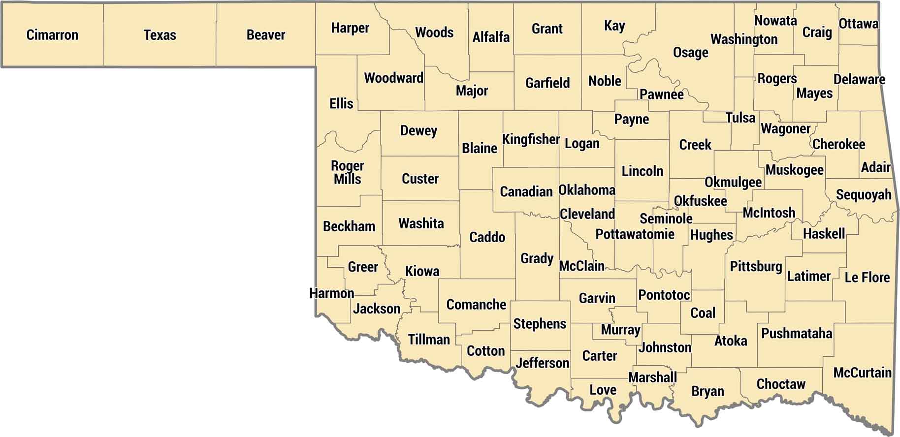 Oklahoma’s counties span prairie, hills, forests, and open spaces. Our county map highlights how the state stretches far to the west. Seventy-seven counties spread across Oklahoma from the panhandle to the Ozark foothills. Eastern counties get green and hilly, western counties are pure Great Plains.