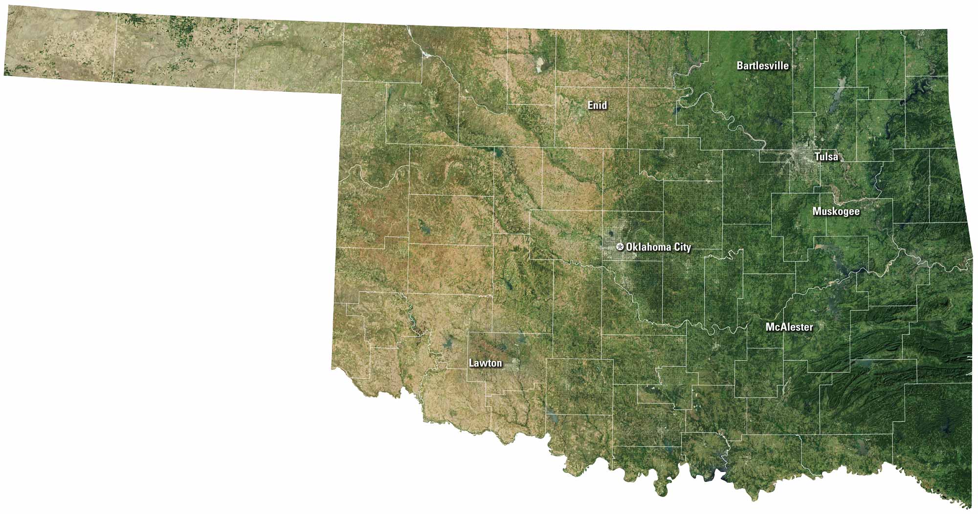 Oklahoma stretches wide with prairies, rolling hills, and red earth. Tulsa and Oklahoma City stand out as hubs of culture and business. The state is rich in rivers and lakes, but its open skies might be what you notice most. Our satellite map shows the balance between land, water, and wide-open space.