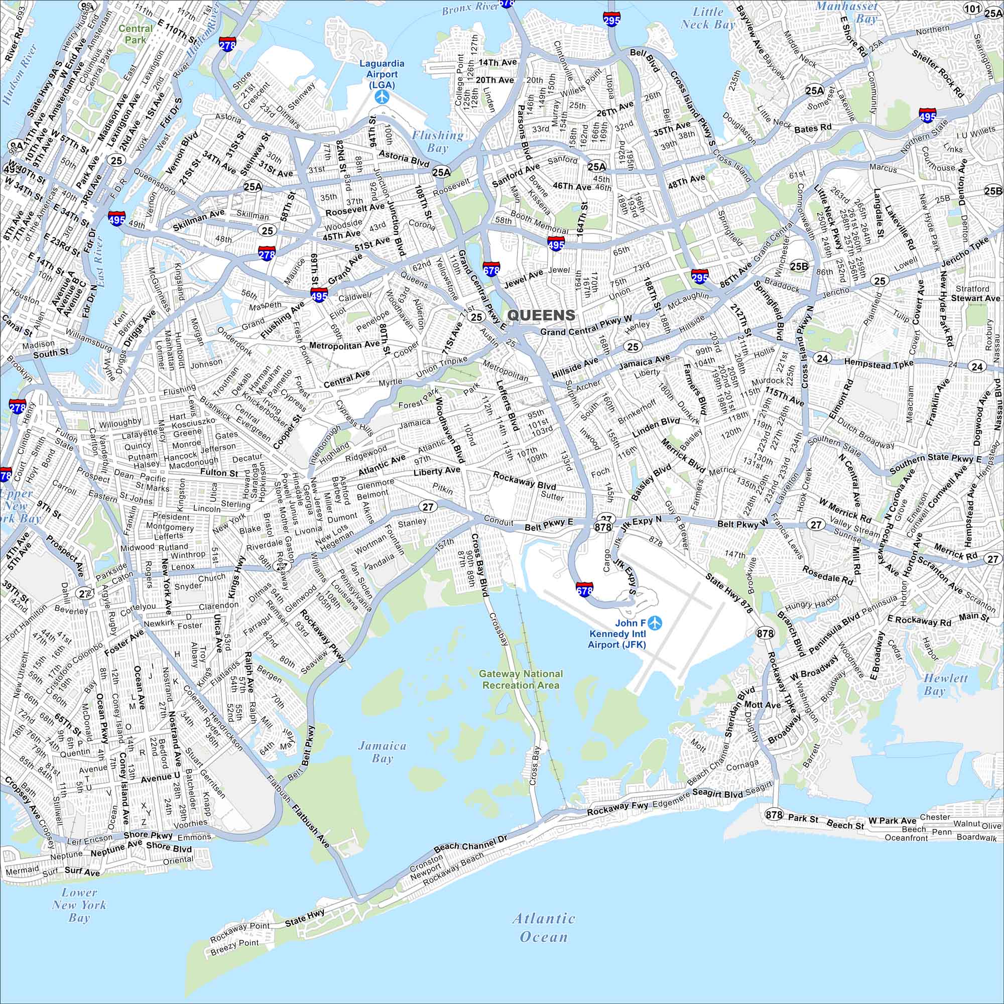 Our map of Queens stretches from the East River to the edge of Long Island. You’ll see airports, parks, and expressways tying neighborhoods together. We’ve mapped this borough in full color.