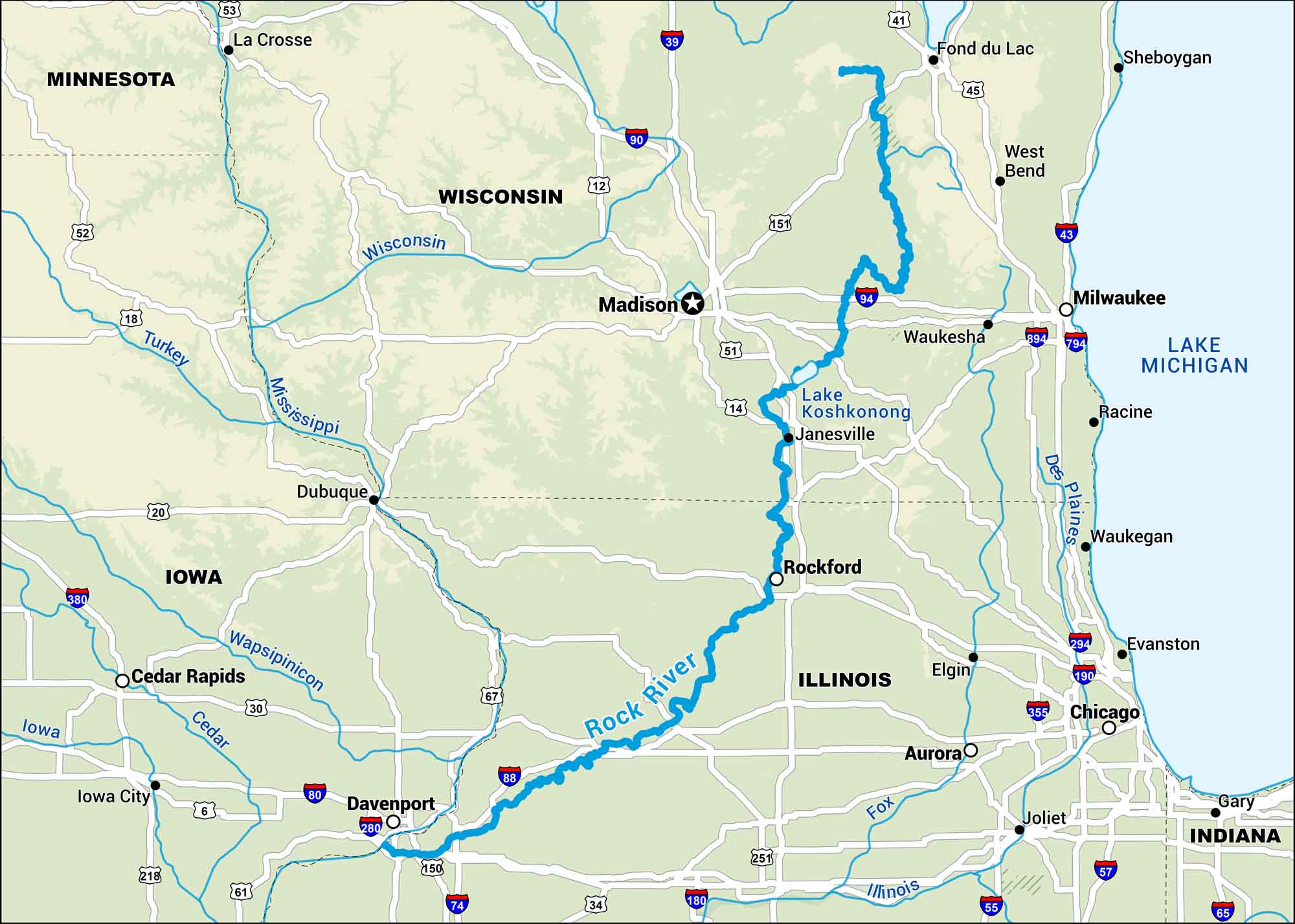 The Rock River flows through Wisconsin and Illinois, and our map shows its steady path toward the Mississippi. It passes old mill towns and stretches of farmland.