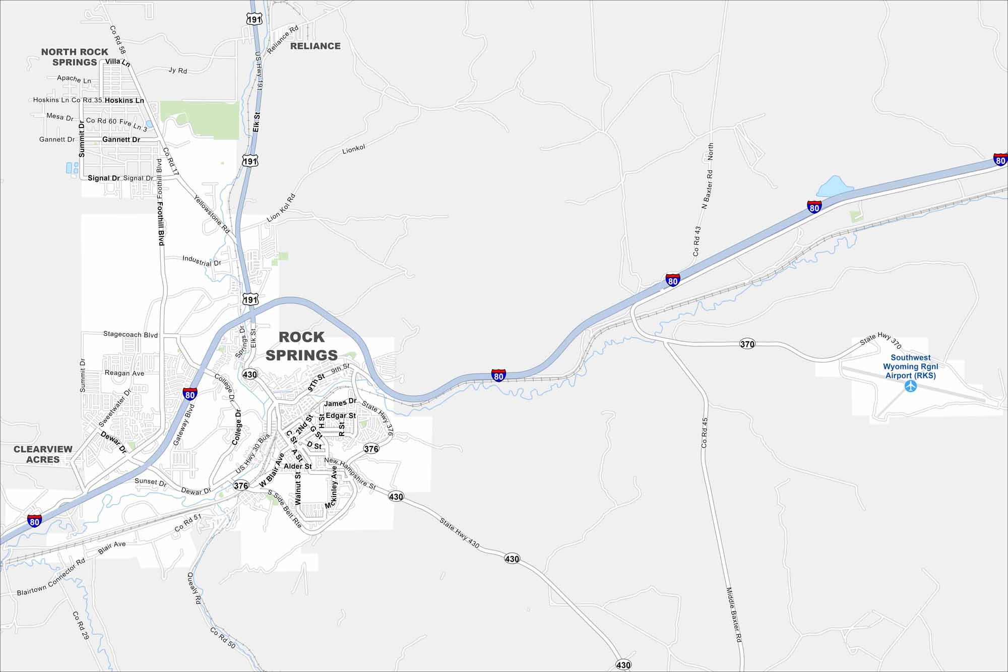 Our Rock Springs map shows the main roads and the open landscape around them. It’s a clear look at how the city spreads through wide country. I think you’ll also notice how the Southwest Wyoming Regional Airport is also part of the city to the east.