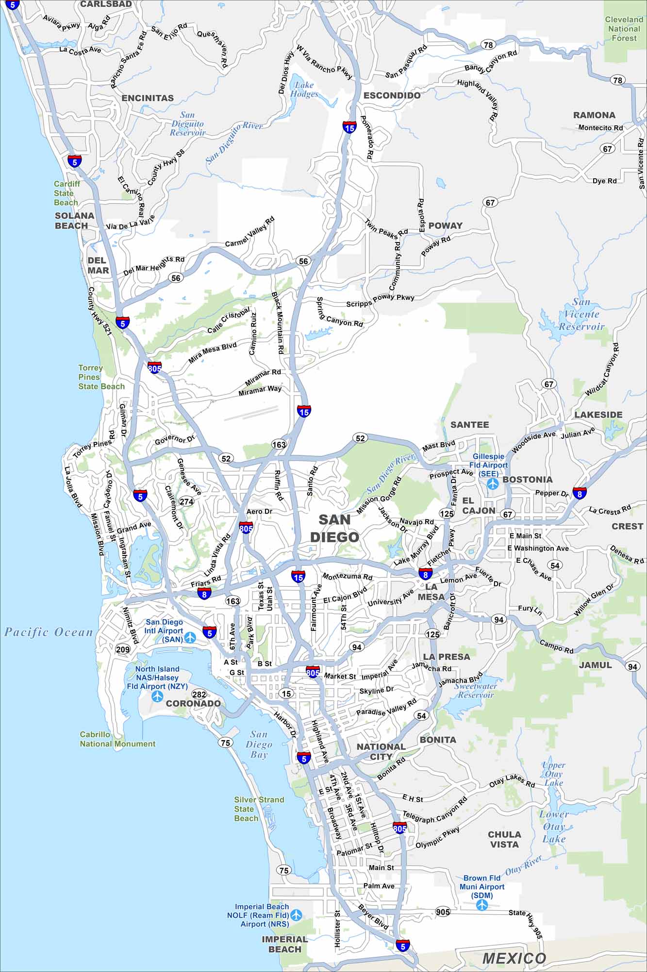 Our map of San Diego highlights its major highways, airports, parks and the waterfront. From beaches to neighborhoods, the layout keeps things clear. It’s a big city but easy to explore with our road map.