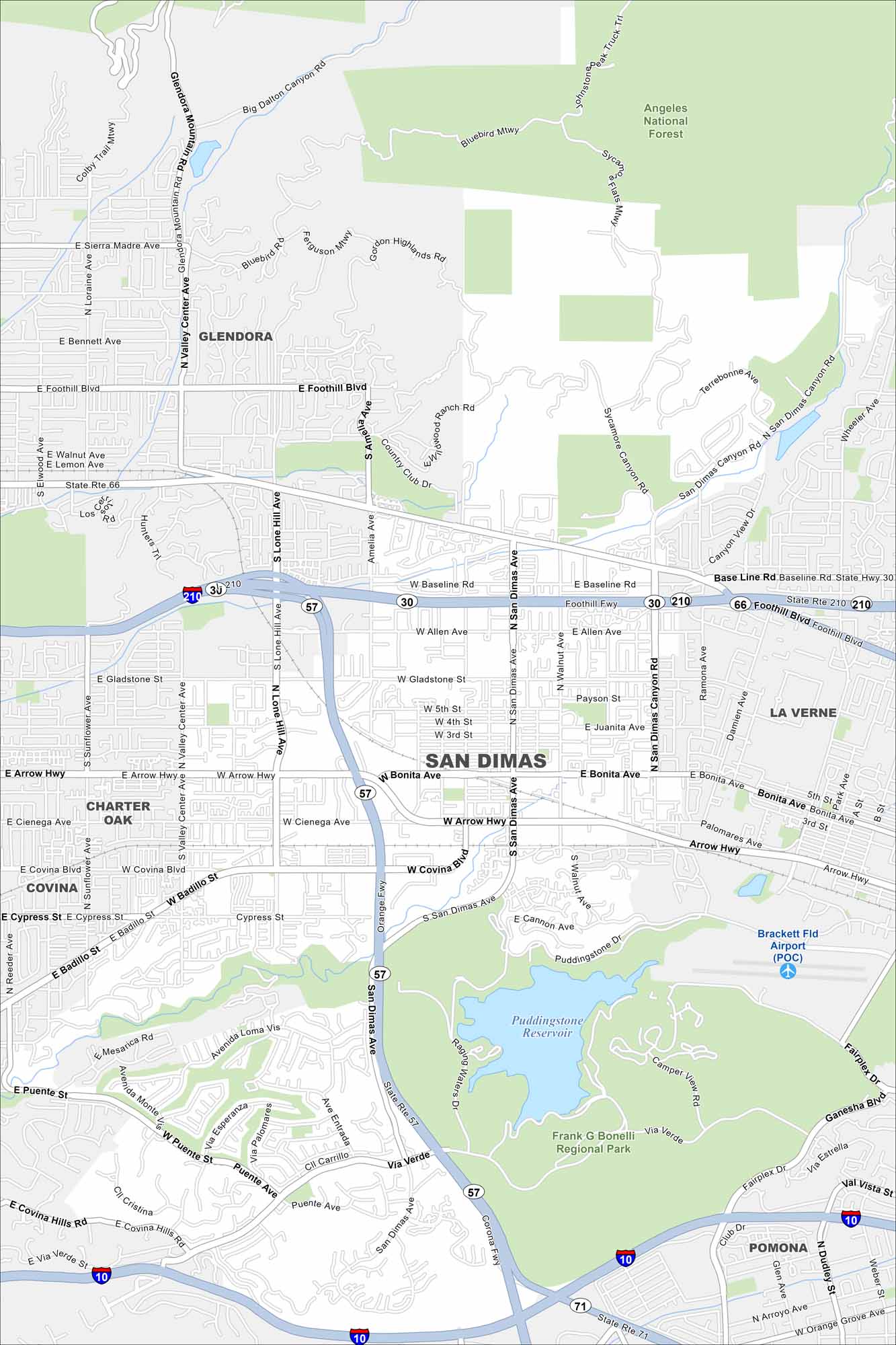 Here’s our map of San Dimas, California. You’ll find quiet neighborhoods, foothill parks, and Puddingstone Reservoir. It’s a community that blends suburbs and recreation.