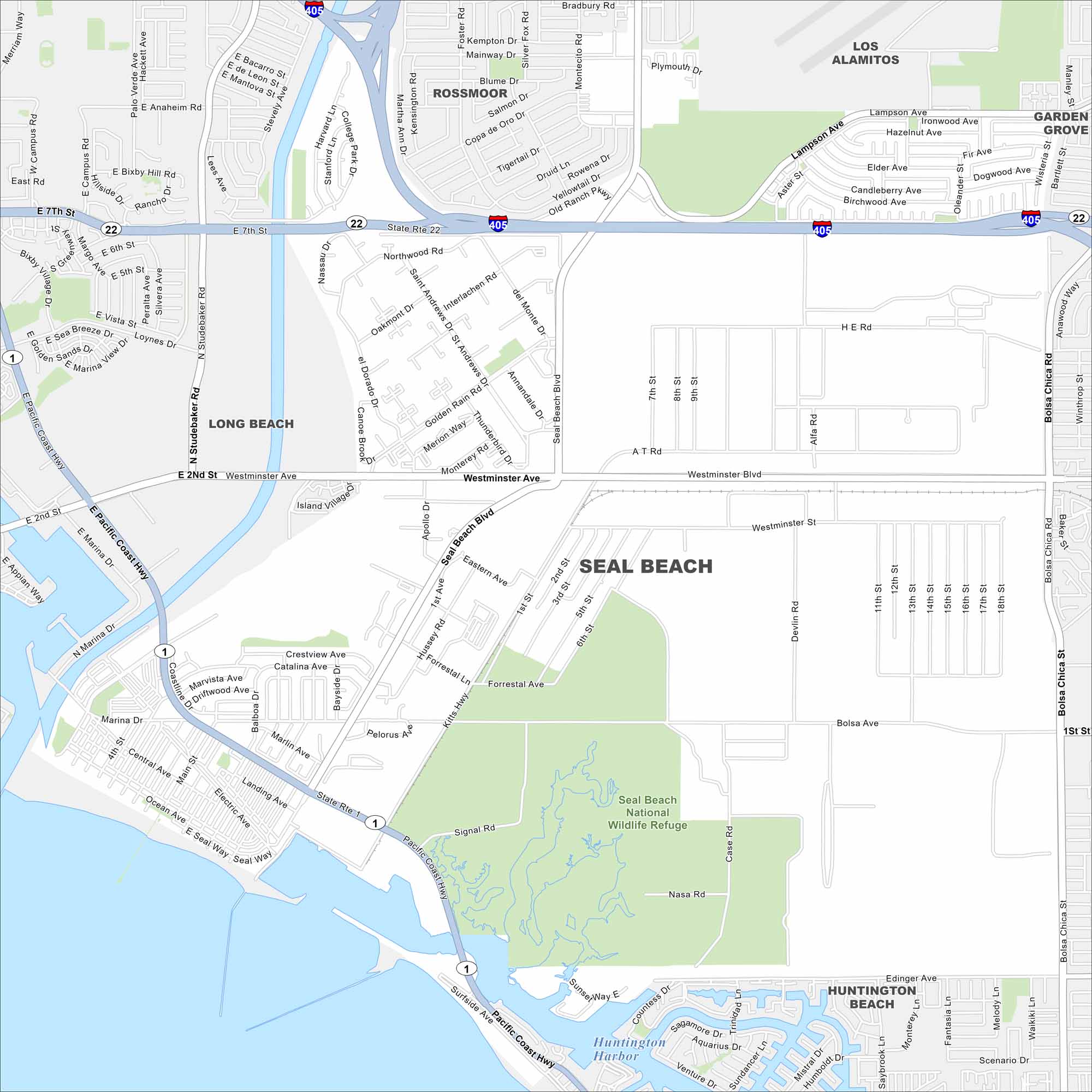 Here’s our map of Seal Beach, tucked between Long Beach and Huntington Beach. Our map shows the pier, neighborhoods, and coastline worth exploring.