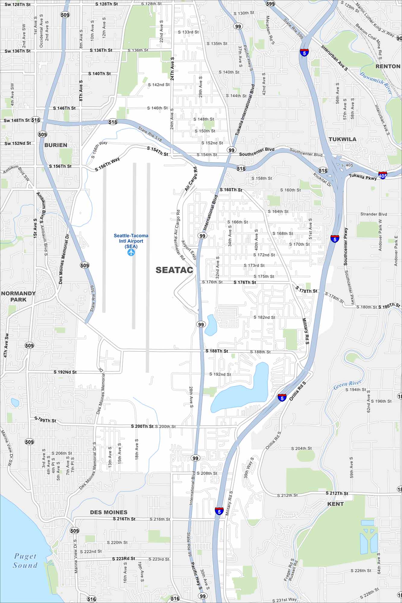 Here’s our map of SeaTac, Washington. Known for its international airport, the city also has lakes, parks, and neighborhoods worth a closer look.