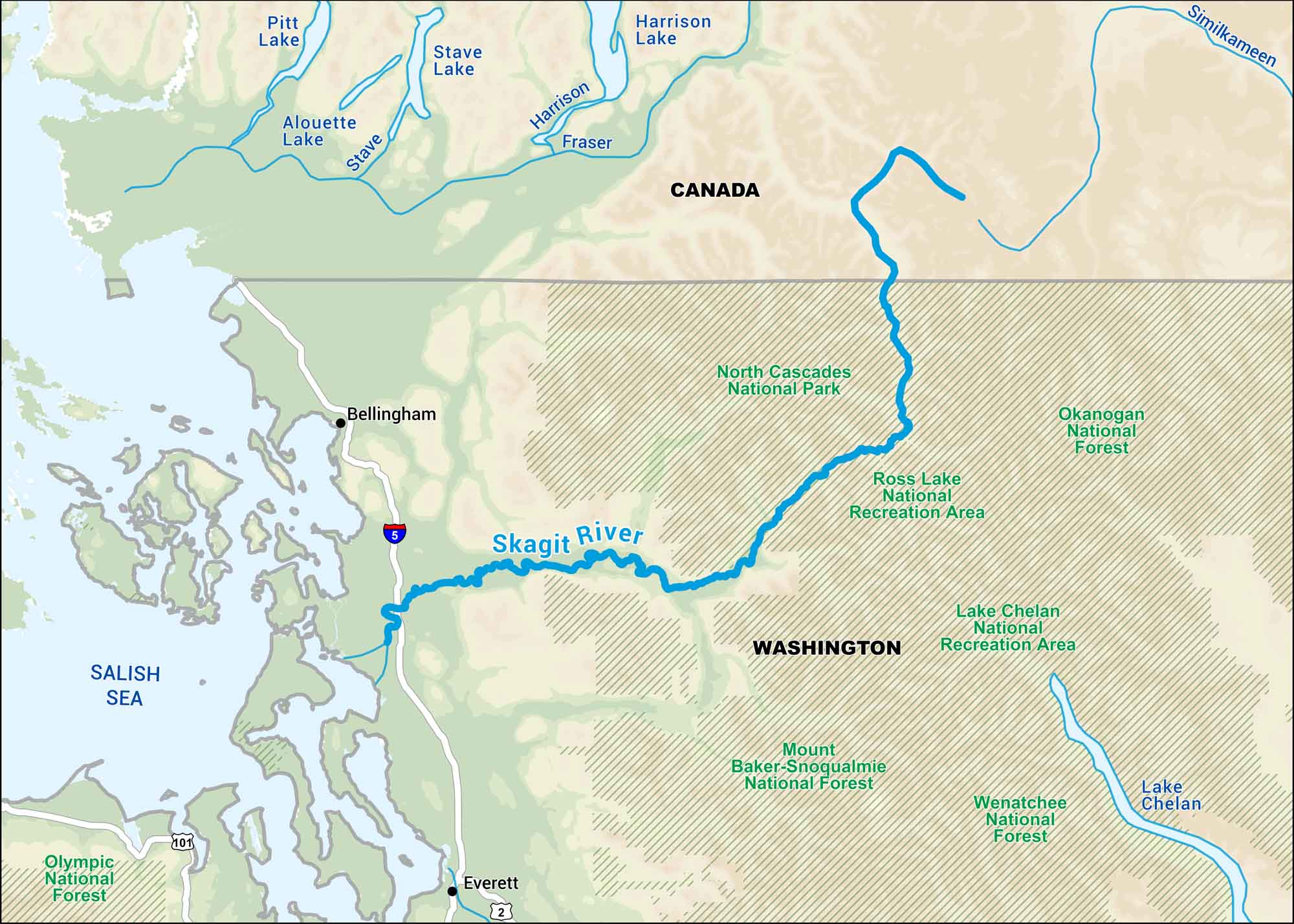 The Skagit River runs from the Cascades down toward Puget Sound. Locals know it for the salmon runs and the way it floods in the spring. Our map follows every curve as it cuts through farmland and mountain country before hitting the lowlands.
