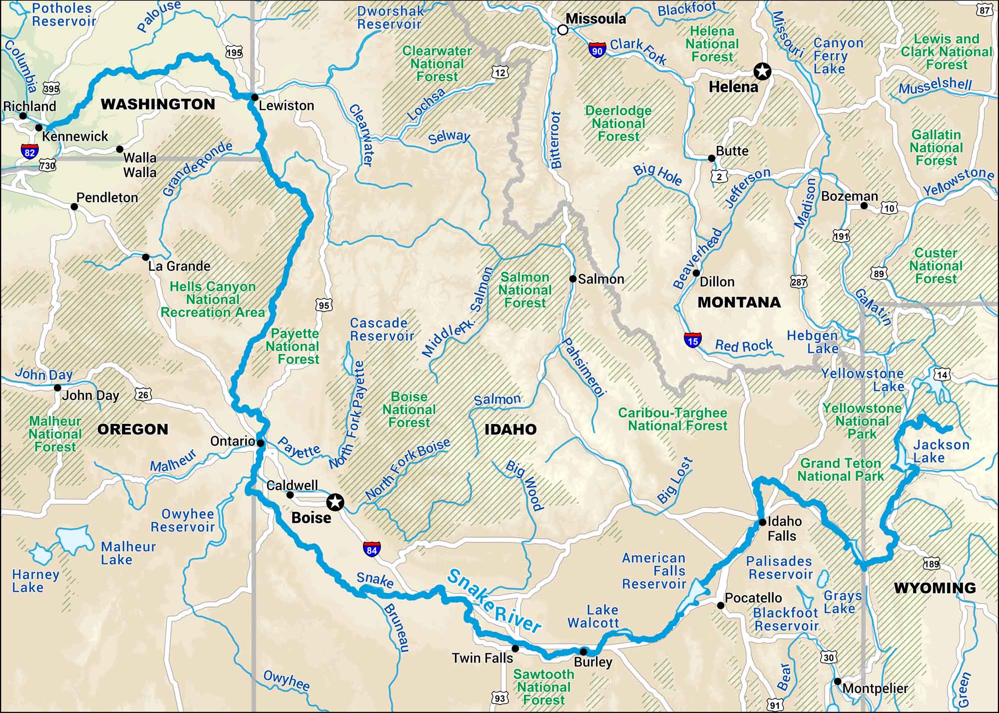 Our map of the Snake River stretches across southern Idaho and beyond. You can follow it for miles and the scenery keeps changing in farmland, desert cliffs, and wide open country.