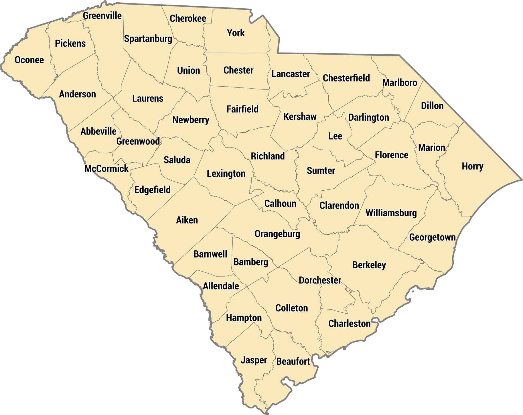 Our South Carolina county map displays 46 counties from the Blue Ridge Mountains to the Atlantic. Lowcountry counties are marshes and sea islands. Charleston County on the coast has history and beaches, while upstate counties like Greenville are growing fast.
