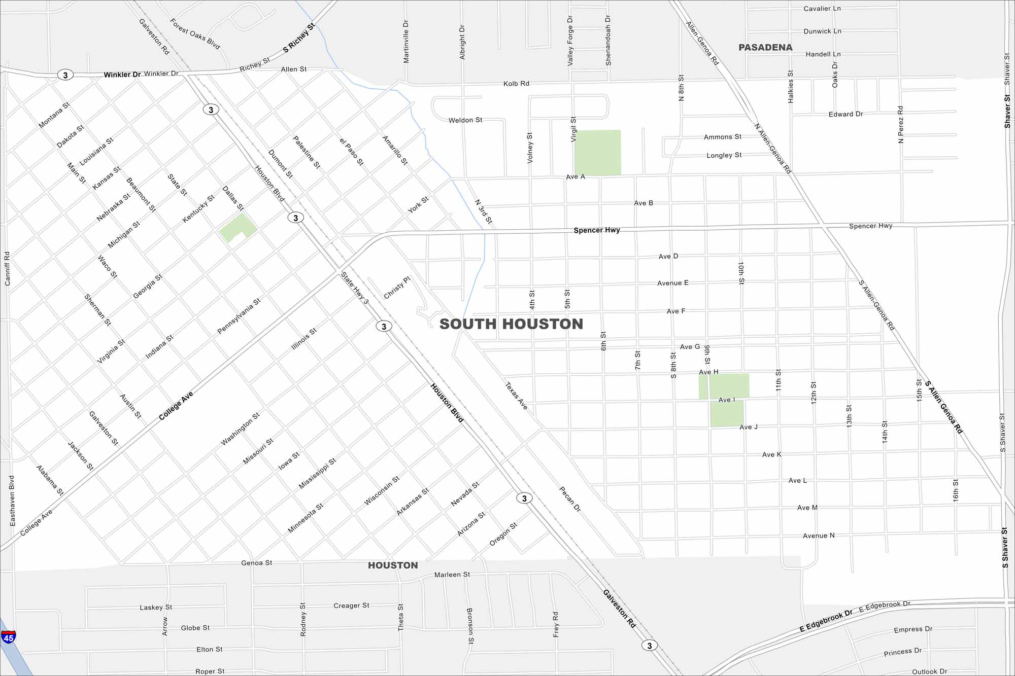This South Houston map shows a close-knit city near Pasadena and Houston. Homes, local shops, and schools keep it grounded in community life.