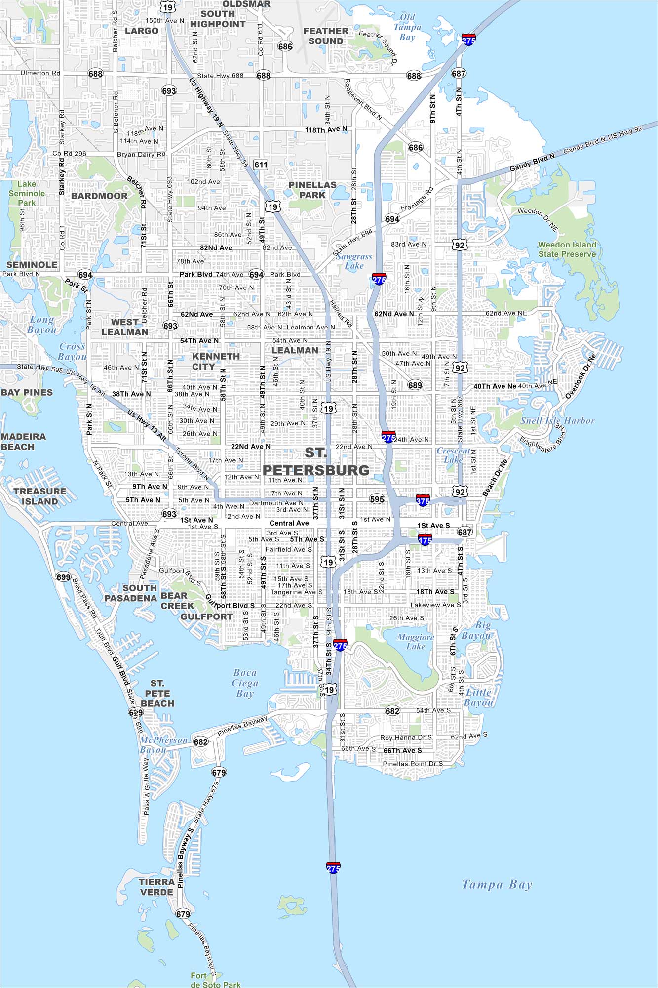 Our map of St. Petersburg shows its waterfront downtown and sandy Gulf beaches. Sunshine, art, and music fill the city year-round. It has so much sunshine that it has a Guinness World Record.