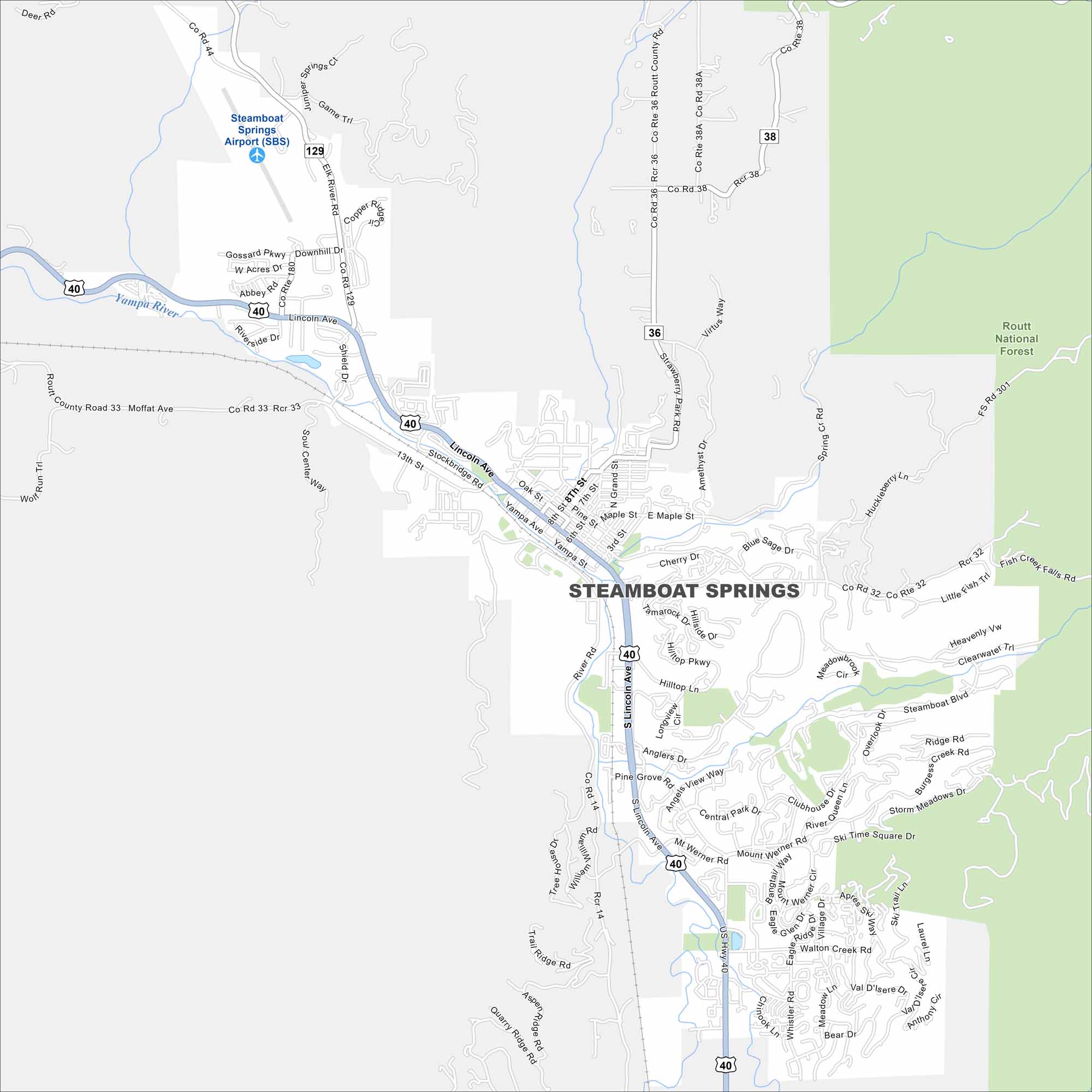 Our map of Steamboat Springs highlights its mountain setting. This city is located in northern Colorado’s Yampa Valley. In summer, the Yampa River trail is just as popular.