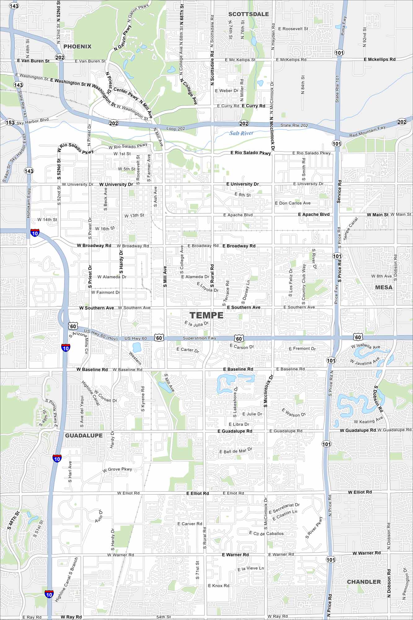 Our Tempe map highlights this lively desert city. It’s home to Arizona State University, Tempe Town Lake, and a busy Mill Avenue scene. It’s also fairly close to Phoenix, Arizona.