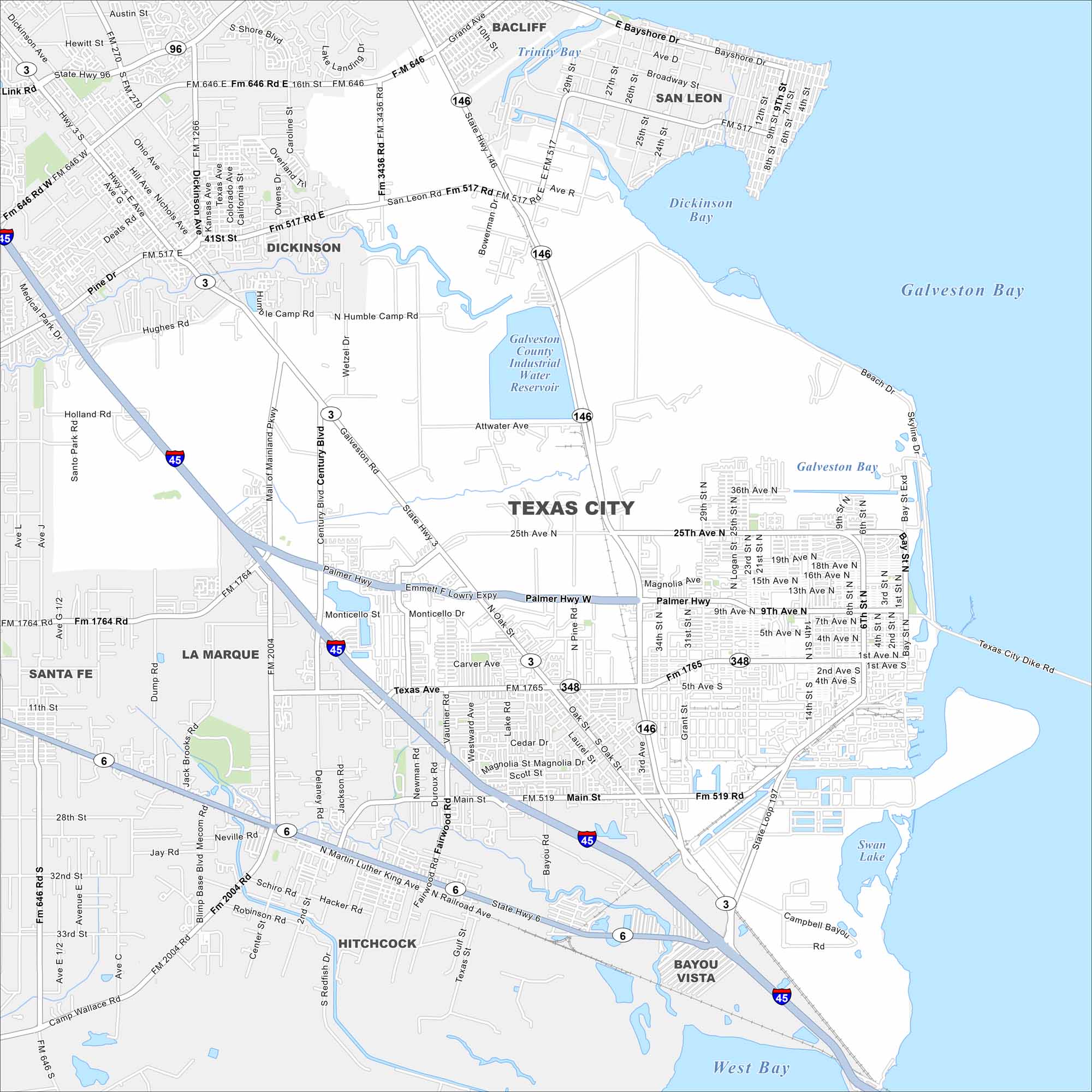 Texas City is an industrial port along Galveston Bay. See how Texas City is connected by highways, refineries, and waterfront access to the Gulf Coast.