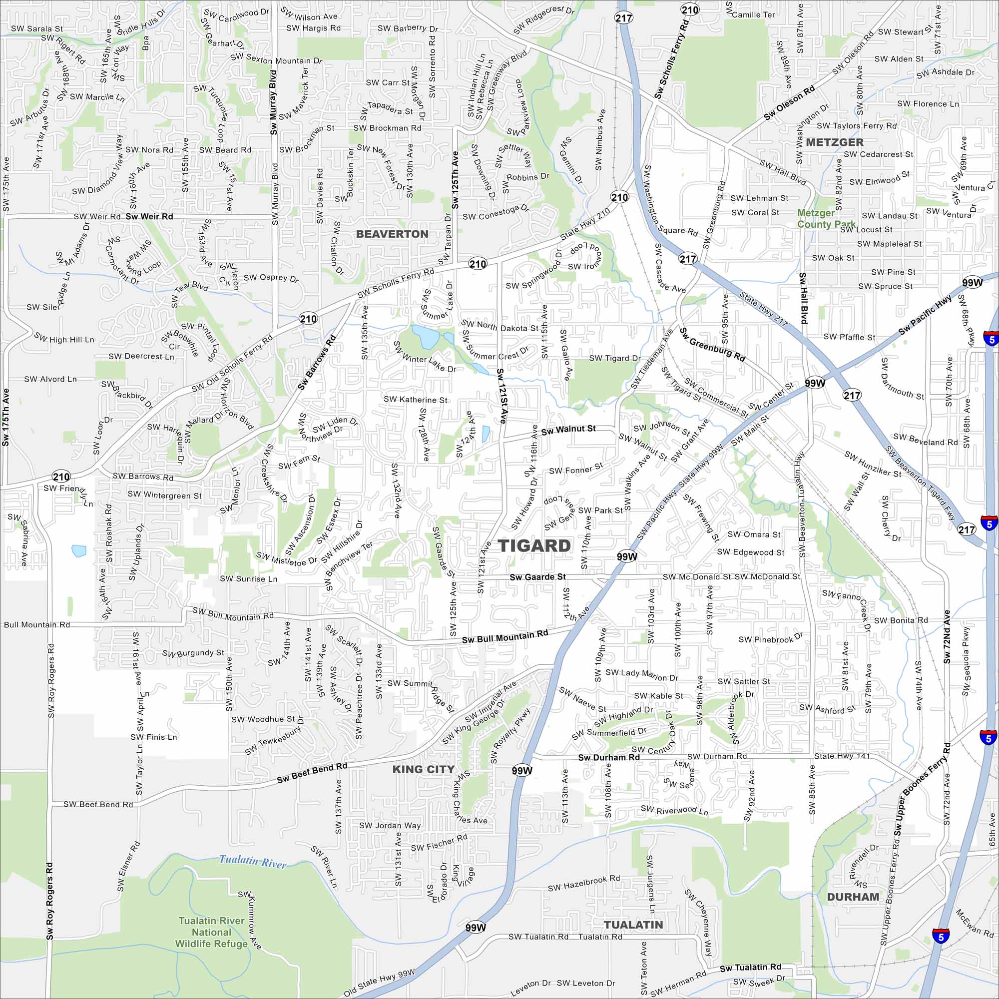 Our map of Tigard helps you explore this Portland metro suburb. It features shopping centers, Tualatin River access, and suburban neighborhoods.