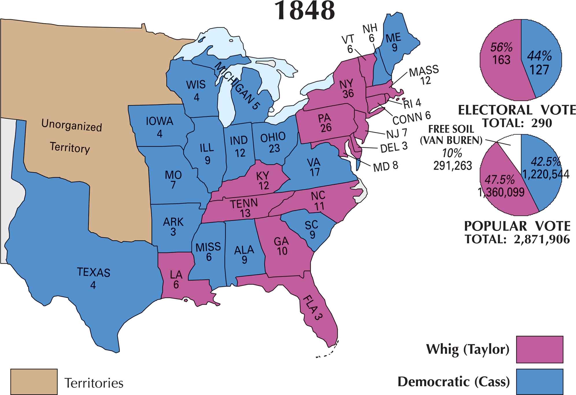 This map of the US 1848 election shows a country divided. Zachary Taylor’s Whig support spreads across the South and much of the West. Lewis Cass’s Democratic strength is mostly in the Northeast and parts of the Midwest. But Taylor’s popularity as a military hero helped him win key states.