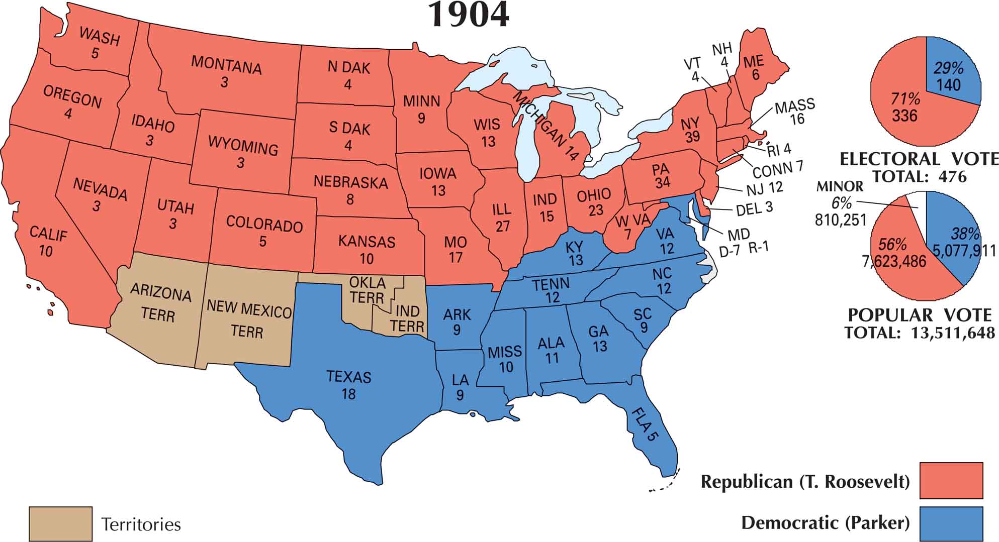 The 1904 election was a landslide for Theodore Roosevelt, easily defeating Democrat Alton B. Parker. Roosevelt swept the northern half of states, while Parker only held a few Southern states. Our US election 1904 map shows a country cheering for Roosevelt’s progressive policies and strong leadership.