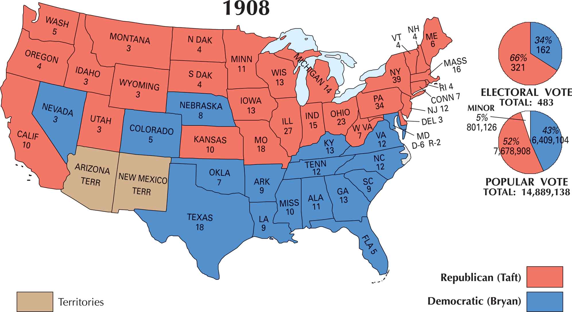 Our US election 1908 map shows the country was split clearly between North and South. William Howard Taft took the White House, dominating the industrial North and Midwest. But William Jennings Bryan kept the South in his column.