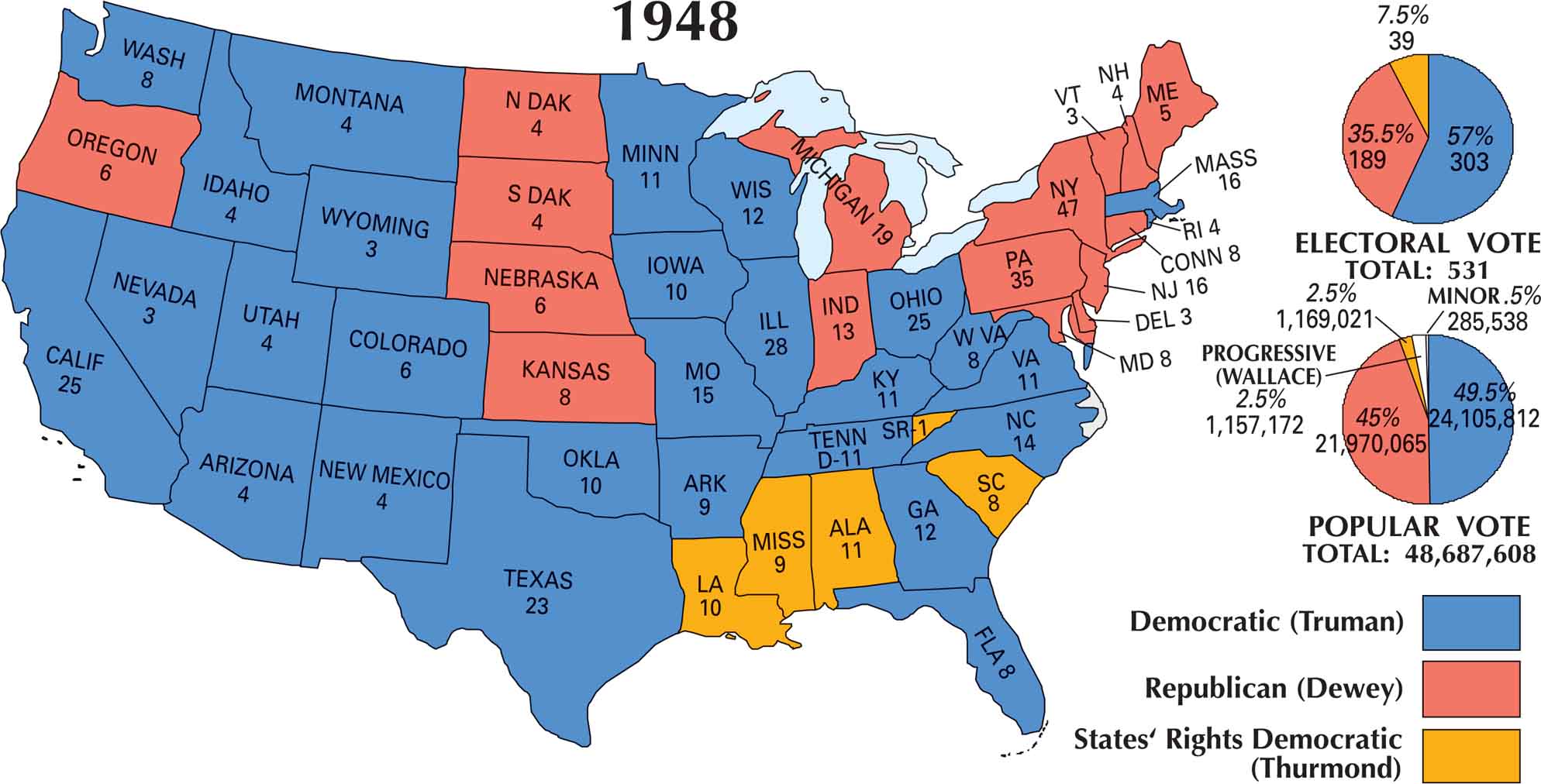 Nobody saw this one coming. The 1948 US election map burst blue after nearly everyone predicted a Republican win. Harry S. Truman stunned the country, defeating Thomas E. Dewey in one of the biggest upsets in U.S. history. A third color appears too. This was Strom Thurmond’s Dixiecrat states in the Deep South, breaking away over civil rights.