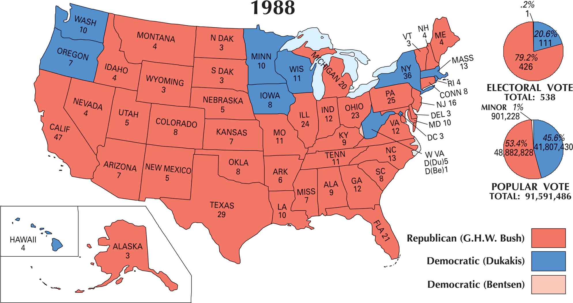 Take a glance at the 1988 U.S. election map and it’s clear… Republican red still ruled. George H. W. Bush swept most of the country and he defeated Democrat Michael Dukakis with relative ease. Voters chose blue mainly in the Northeast and along the Pacific Coast.