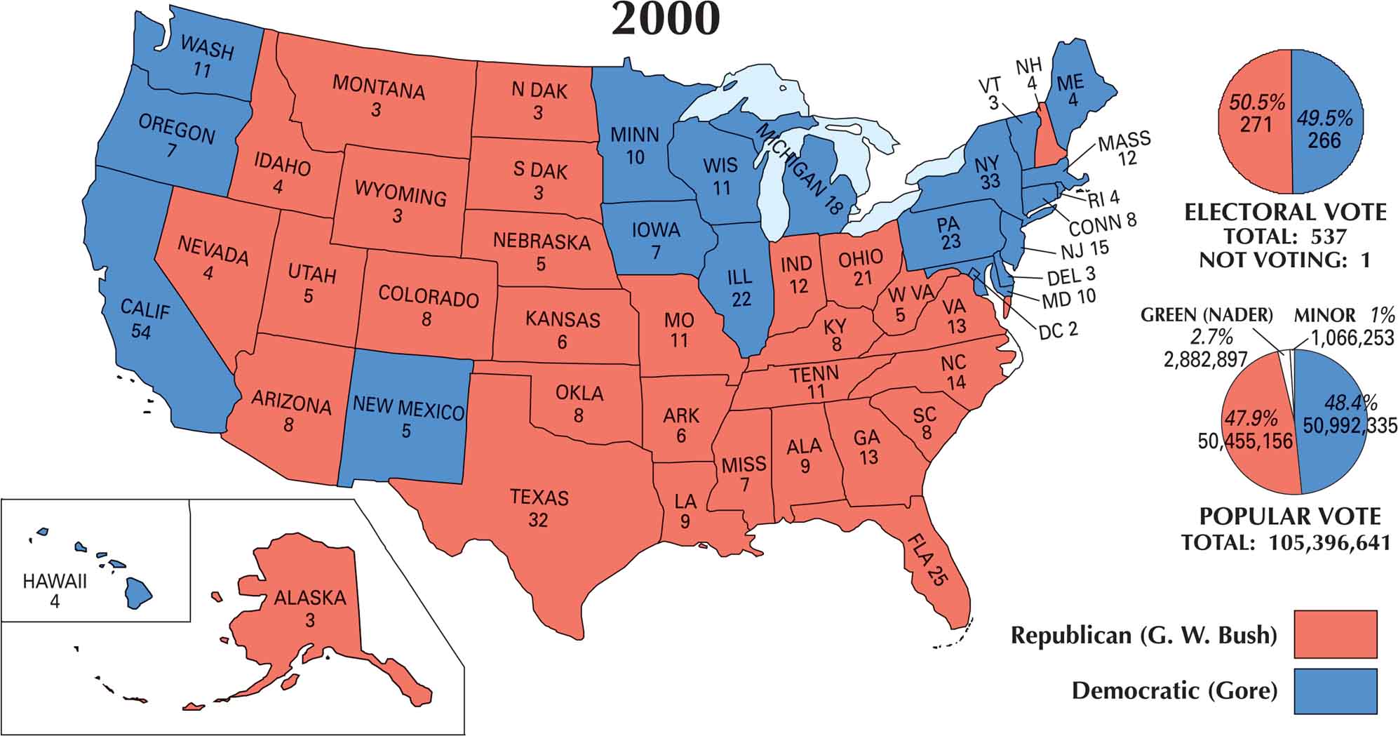 The 2000 U.S. election map is split almost perfectly in half. George W. Bush won the presidency after one of the closest and most contested races in U.S. history. Red dominates the South, Midwest, and much of the Mountain West. Blue is clustered along the coasts and Great Lakes. The narrow result came down to Florida and it was just a few hundred votes deciding an entire election.