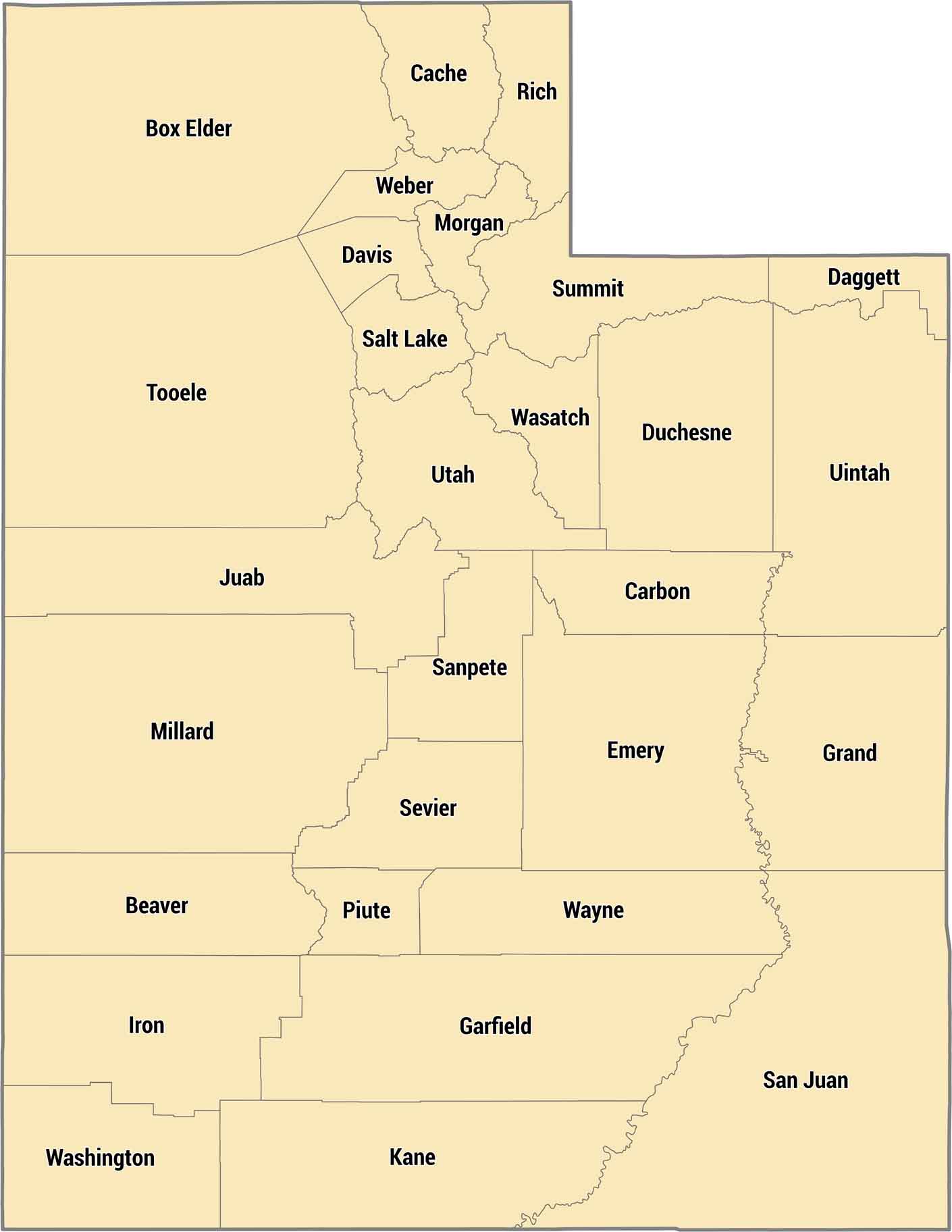 There are just 29 counties in Utah. But they cover everything from red rock desert to snowy mountains. Salt Lake County holds most of the population along the Wasatch Front. Southern counties like San Juan and Wayne are slickrock canyonlands where towns are hours apart.