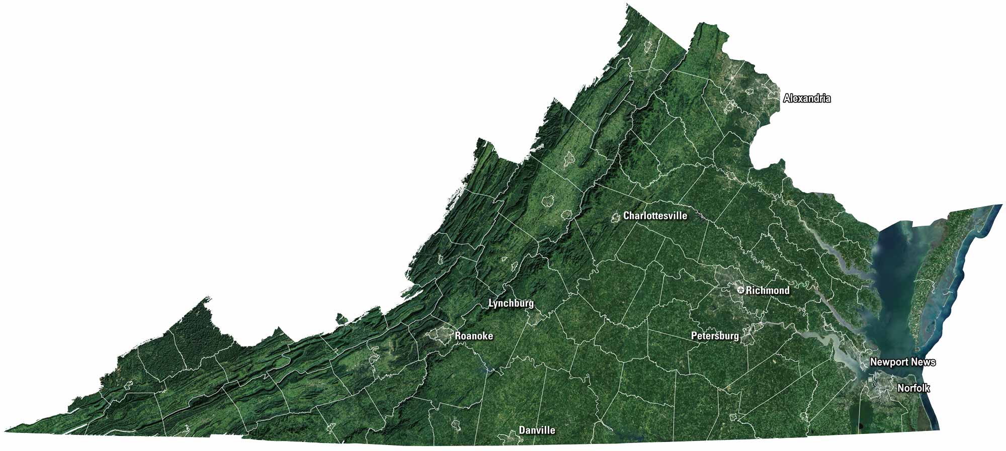 Rolling hills meet long stretches of Atlantic shoreline in Virginia. Our Virginia satellite map displays Richmond, Norfolk, and Roanoke. The Blue Ridge Mountains run down the west but rivers like the James and Potomac flow through the state. It’s a state that feels both historic and naturally rich.