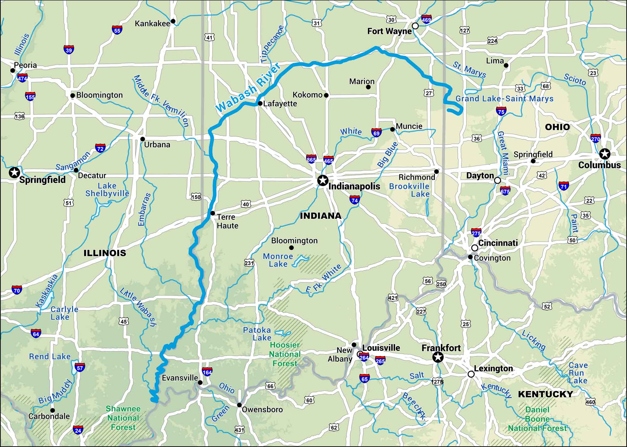 Take a look at our Wabash River map stretching across Indiana. The river moves from Ohio’s border to the Illinois line, running beside farmland and old industrial towns. It’s a quiet but steady landmark through the state’s heartland.