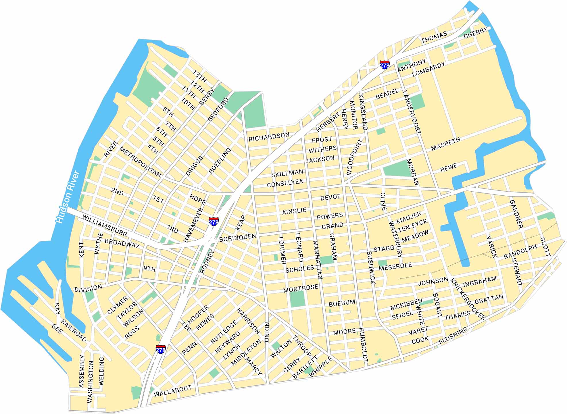 Our map of Williamsburg in New York shows its streets along the East River and into Brooklyn. You’ll see parks, main roads, and the waterfront. The area has a mix of old warehouses, new apartments, and a lively arts scene.
